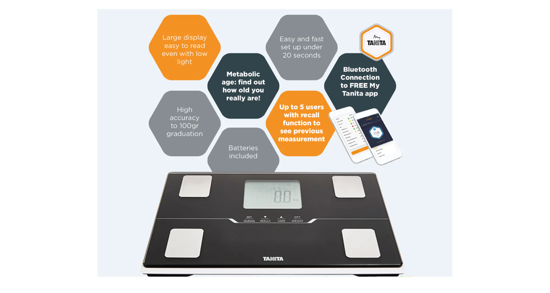 Platforma s čtyřelektrodovým systémem dokáže automaticky rozpoznat zadaného uživatele (max. 4 osoby), podle nejbližší zjištěné tělesné váhy, přičemž inverzní display rozliší každého z nich jiným barevným podsvícením. Zapnutí se aktivuje pouhým nástupem na platformu z tvrzeného skla. TANITA BC-401 používá bioelektroimpedanční technologii "scanu" - BIA. Ta poskytuje vysoce přesnou neivazivní metodu v tomto případě výrobcem udávanou přesností vážení na 100 g, resp. 0,1 %.