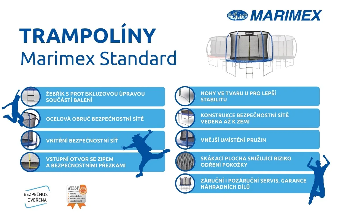 Trampolína Marimex je skvělým doplňkem každé zahrady a vaše děti si skákání na této trampolíně rychle zamilují. Dokonalou stabilitu zajišťují tři nohy ve tvaru písmene U. Nosnost je 50 kg.