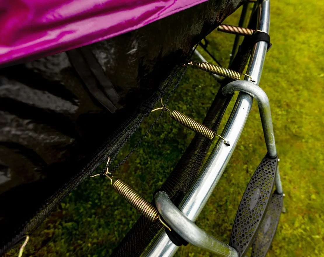 Nohy trampolíny jsou samostatné a zvyšují stabilitu celé trampolíny. Spojení tyčí nohou trampolíny a sítě je jištěno speciálními sponami.