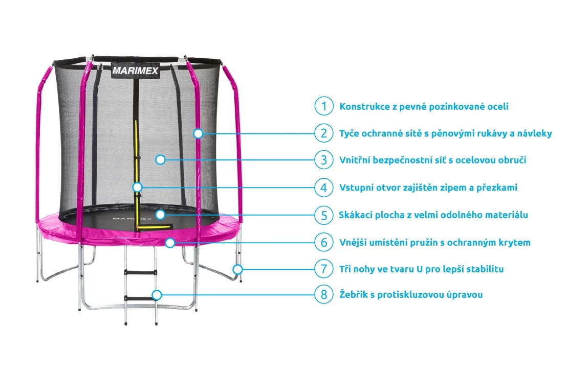 Vnitřní ochranná síť je součástí balení a není třeba ji dokupovat zvlášť. Vnitřní ochranná síť je bezpečnější než vnější síť - brání přístupu skákajícího do části s pružinami. Vstupní prostor je zajištěn třemi přezkami a brání vypadnutí. Tyče jsou obaleny ochranným návlekem z měkčené pěny.