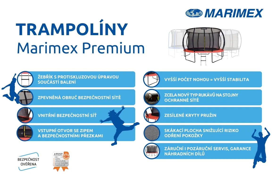 Na bezpečnostní prvky trampolín Marimex Premium je kladen velký důraz, proto jsou řazeny mezi nejbezpečnější a nejspolehlivější na českém trhu.