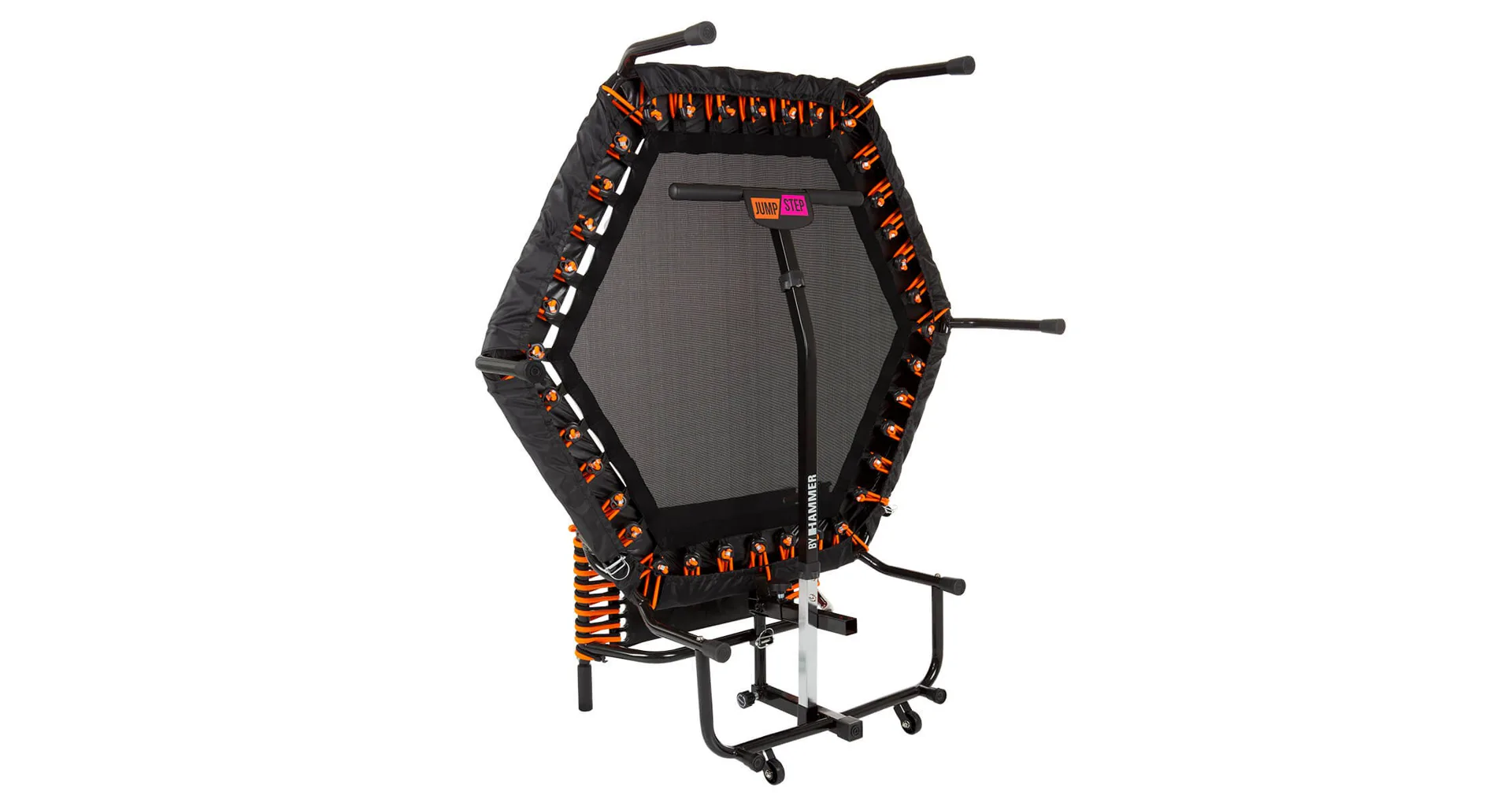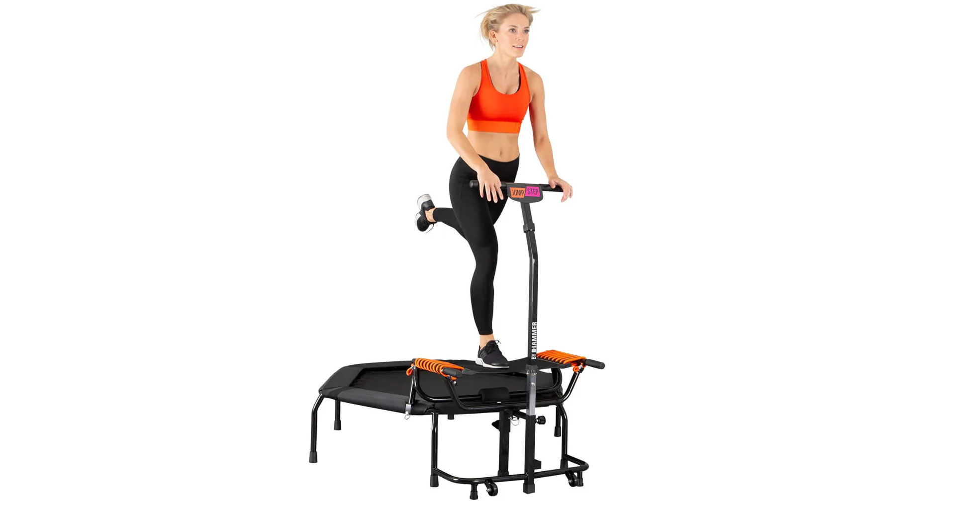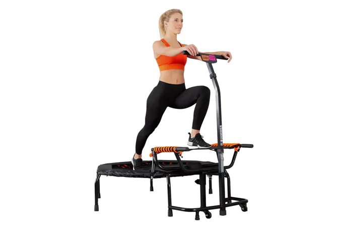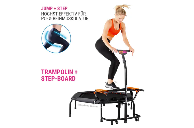 Fitness trampolína HAMMER JumpStep je speciální trampolína s madlem a flexibilní stupačkou pro intenzivní trénink hýždí. Zkombinujte skákání se step aerobikem. S inovativní nášlapnou deskou trampolíny JumpStep můžete provádět ještě více skákacích choreografií než s klasickou trampolínou. Trampolína Jump Step pozvedla skákání na novou úroveň.