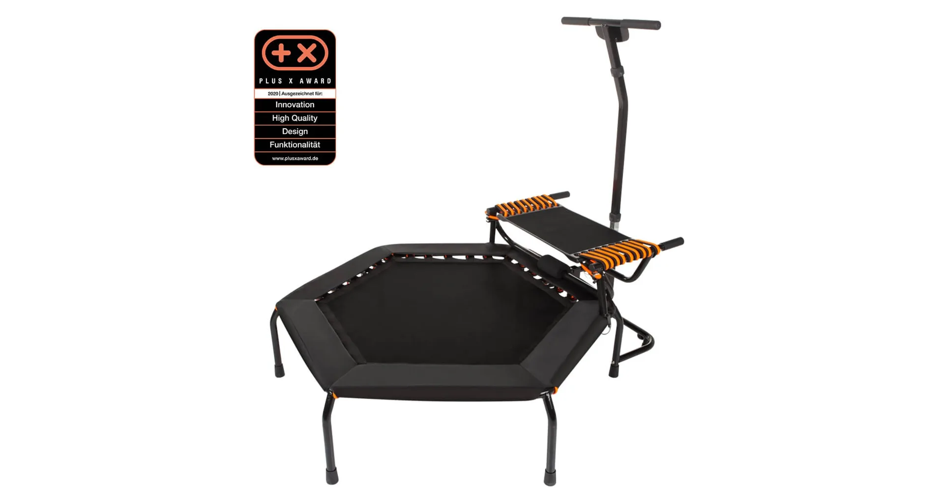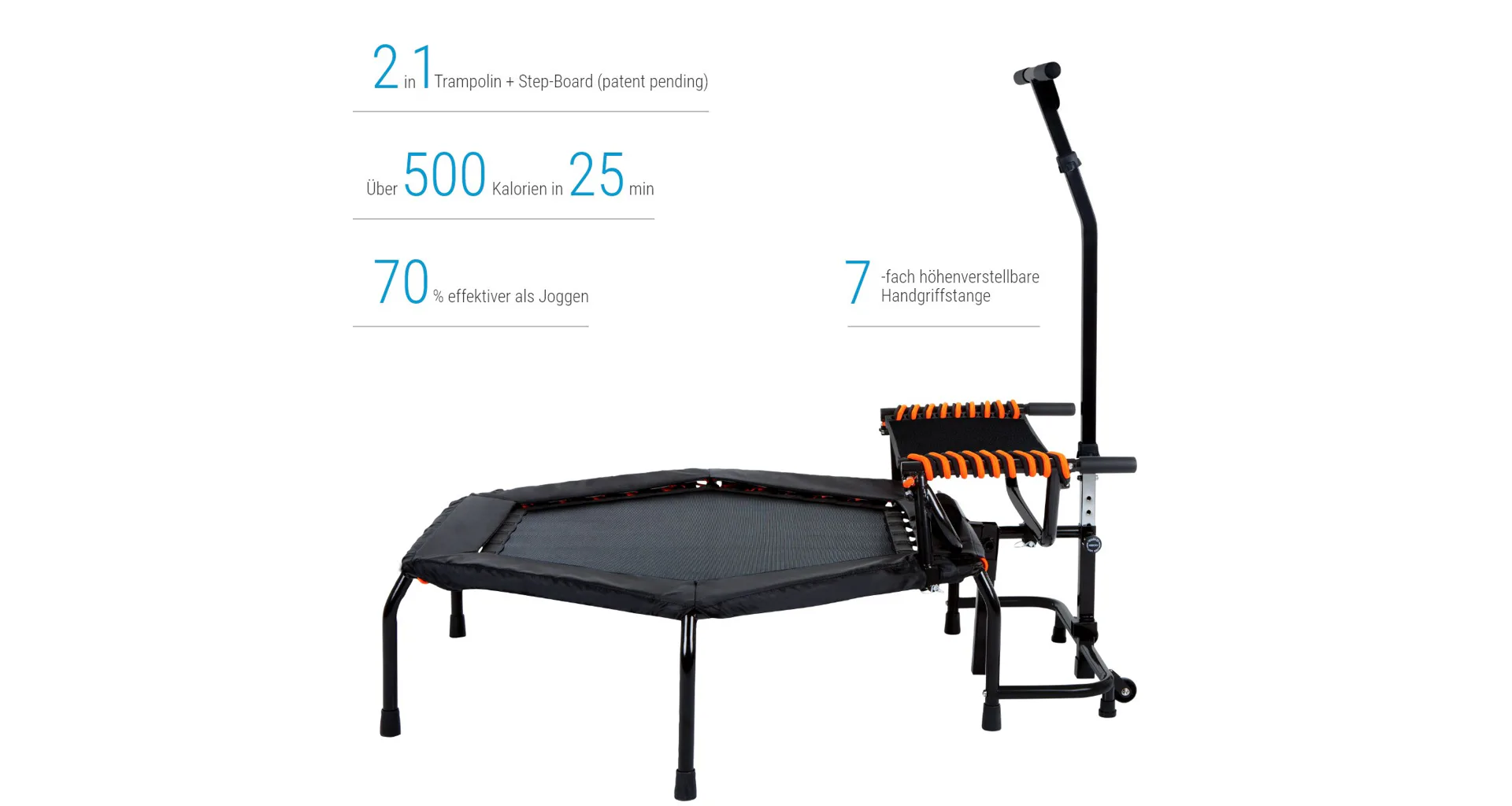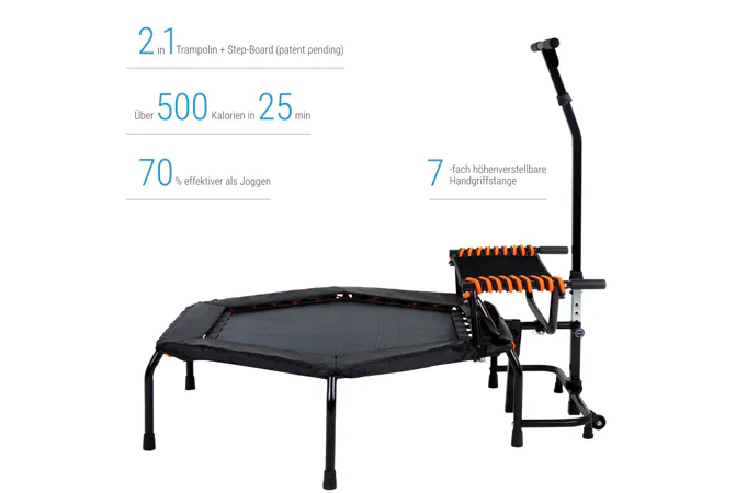 Kromě klasické trampolíny má JumpStep flexibilní a kloubům šetrnou nášlapnou desku s protiskluzovým povrchem a nabízí tak mnoho dalších možností pro váš trénink. S trampolínkou JumpStep dosáhnete nejen extrémně vysoké spotřeby kalorií, ale také posílíte hýždě a svaly nohou mnohem více se stepboardem než klasickým tréninkem na fitness trampolínách. Nášlapnou desku lze jednoduše odmontovat.