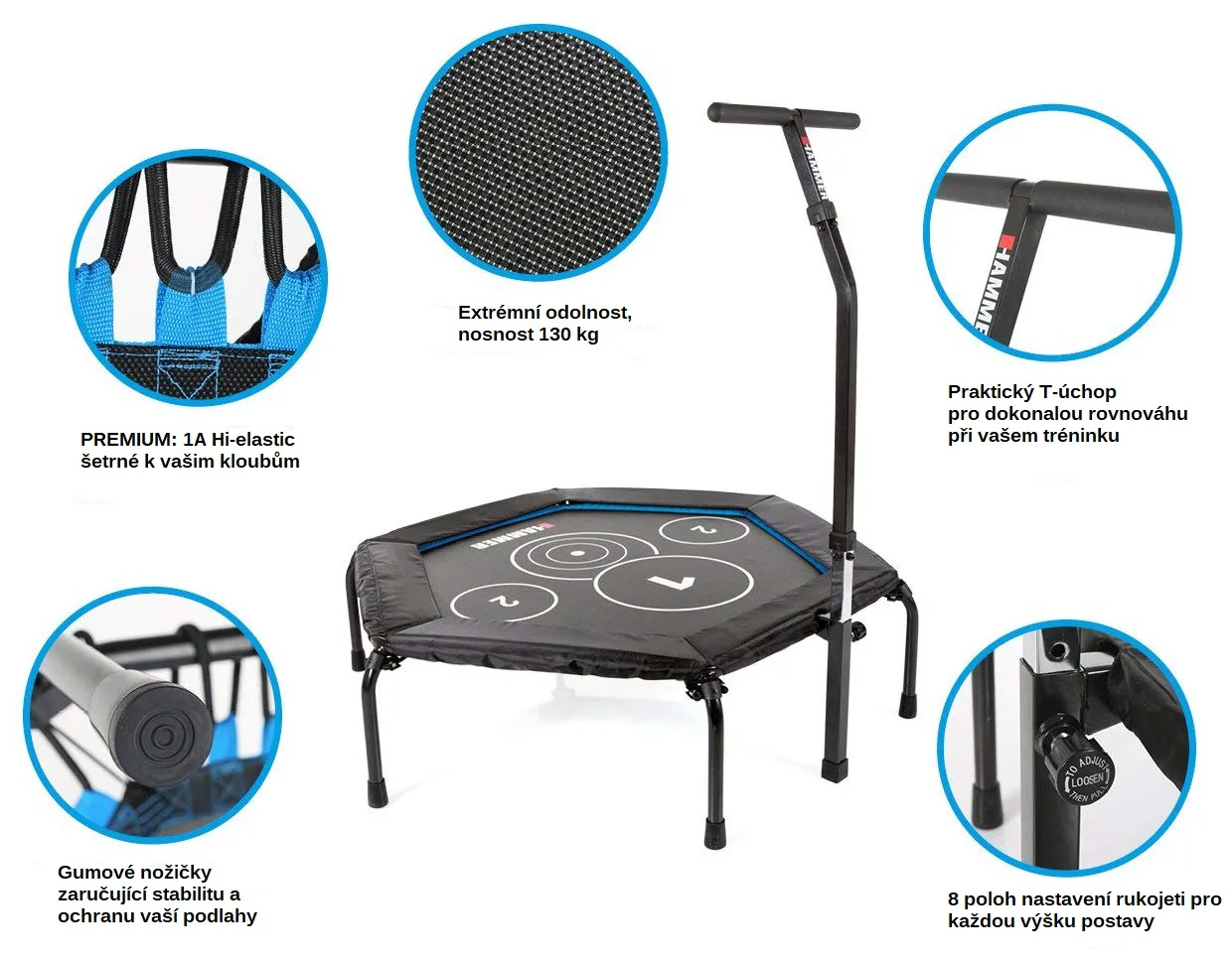 Trampolína Fitness Cross Jump HAMMER je speciální trampolína pro účinnější a efektivní skákání. Je vyrobena z kvalitního materiálu a máš šestihranné provedení. Obsahuje kruhové body na skákací ploše, které poskytují perfektní tréninkový podnět a ještě účinnější cvičení. Trampolína je vybavena madlem ve tvaru-T, díky kterému se můžete při skákání přidržovat. Trampolínu lze po cvičení složit a uložit například pod postel.