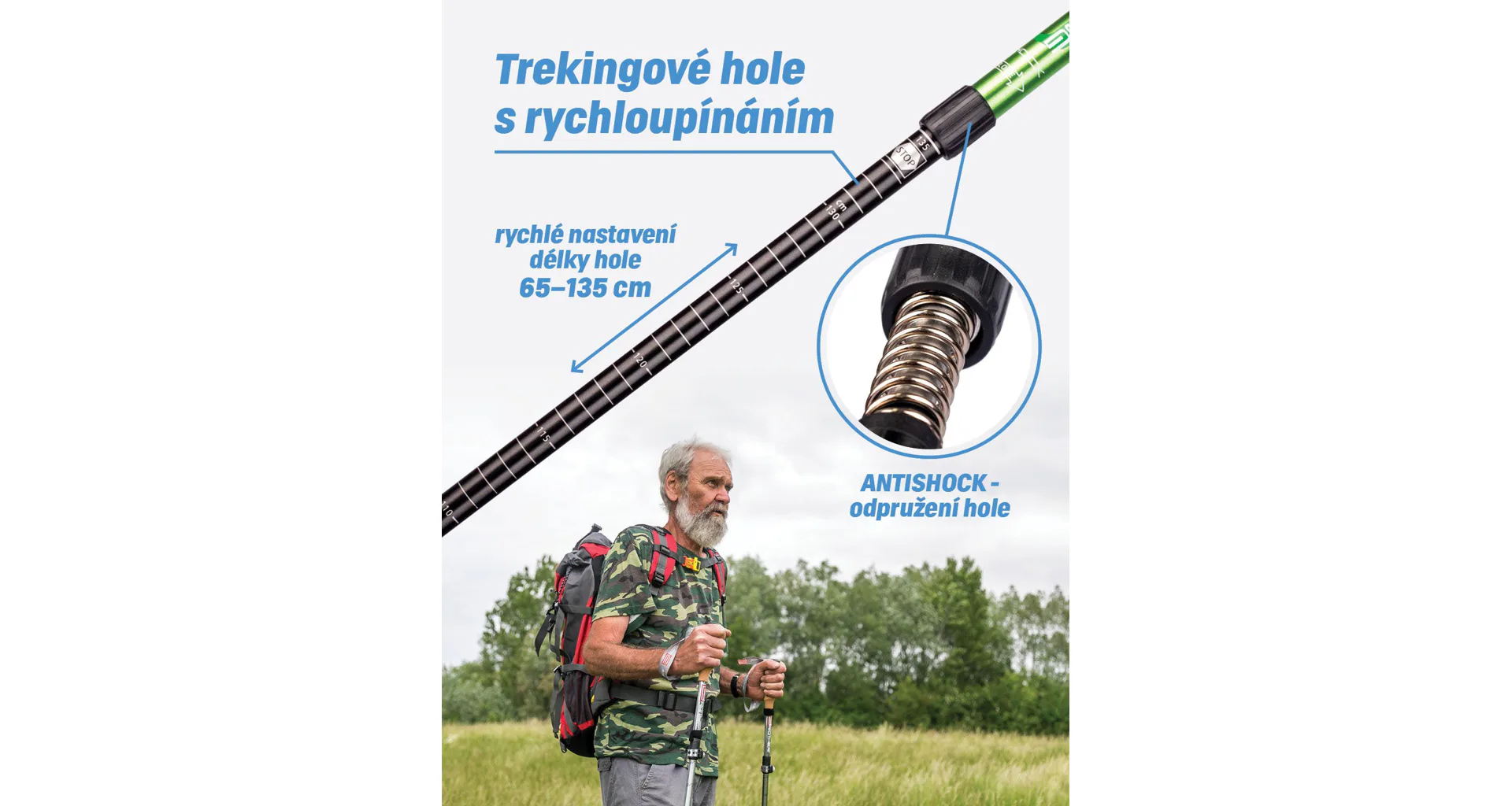 Teleskopické trekingové hole s příslušenstvím ACRA LTH1301. Hole 3-dílné AL + grafit, NORDIC Walking, ANTISHOCK - odpružení hole, nastavitelné rozpětí délek je 65 - 135 cm. Jde o perfektního pomocníka na turistiku i běžnou chůzi.