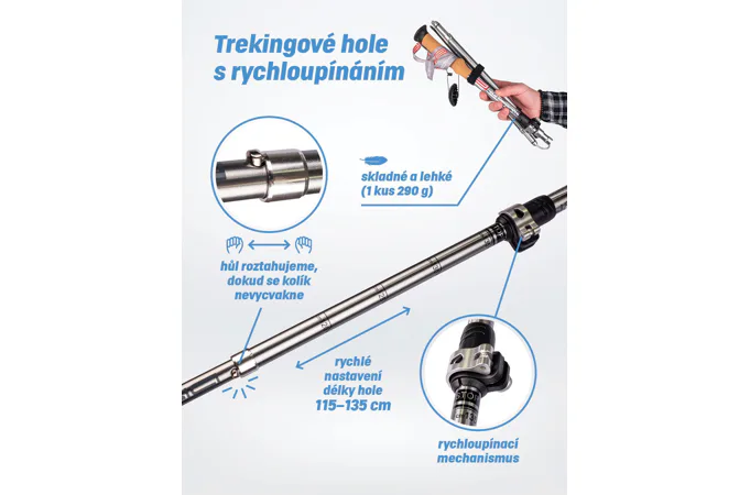 Speciální lehké a dobře skladné trekingové hole s 5-dílným skládacím mechanismem jsou určené pro náročné horské výstupy, kde je ceněná skladnost a nízká hmotnost holí při zachování plné funkčnosti. Hole mají tvarovanou korkovou rukojeť s příjemným pevným poutkem pro lepší držení holí. Výhodou holí je nízká hmotnost, pevnost v tlaku a minimální náročnost na úložní prostor. Délka holí je nastavitelná v rozmezí 115 - 135 cm.