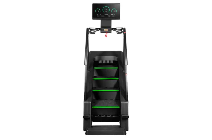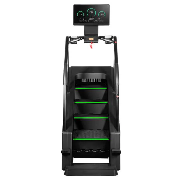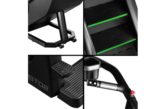 Stroj má robustní konstrukci, která zaručuje stabilitu při intenzivním tréninku. Protiskluzové schody pod úhlem 35 stupňů zajišťují pohodlí a bezpečnost při používání. Samoblokovací systém schody automaticky zastaví, pokud je zatížení menší než 30 kg.