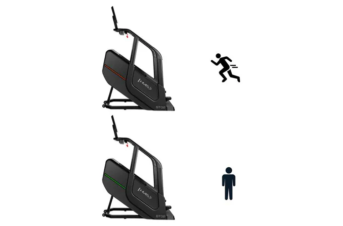 Schody ST02 je vybaven funkcemi měření rychlosti, počtu kroků, vystoupané výšky, času, spálených kalorií, tepové frekvence a tělesného tuku, které vám umožní sledovat vaše pokroky a přizpůsobit trénink vašim individuálním cílům. Bezdrátová nabíječka umožňuje pohodlné nabíjení mobilních zařízení během cvičení. Intuitivní ovládací panel s tlačítky pro regulaci rychlosti a tlačítky start/stop na madlech zajišťuje jednoduché a rychlé ovládání.