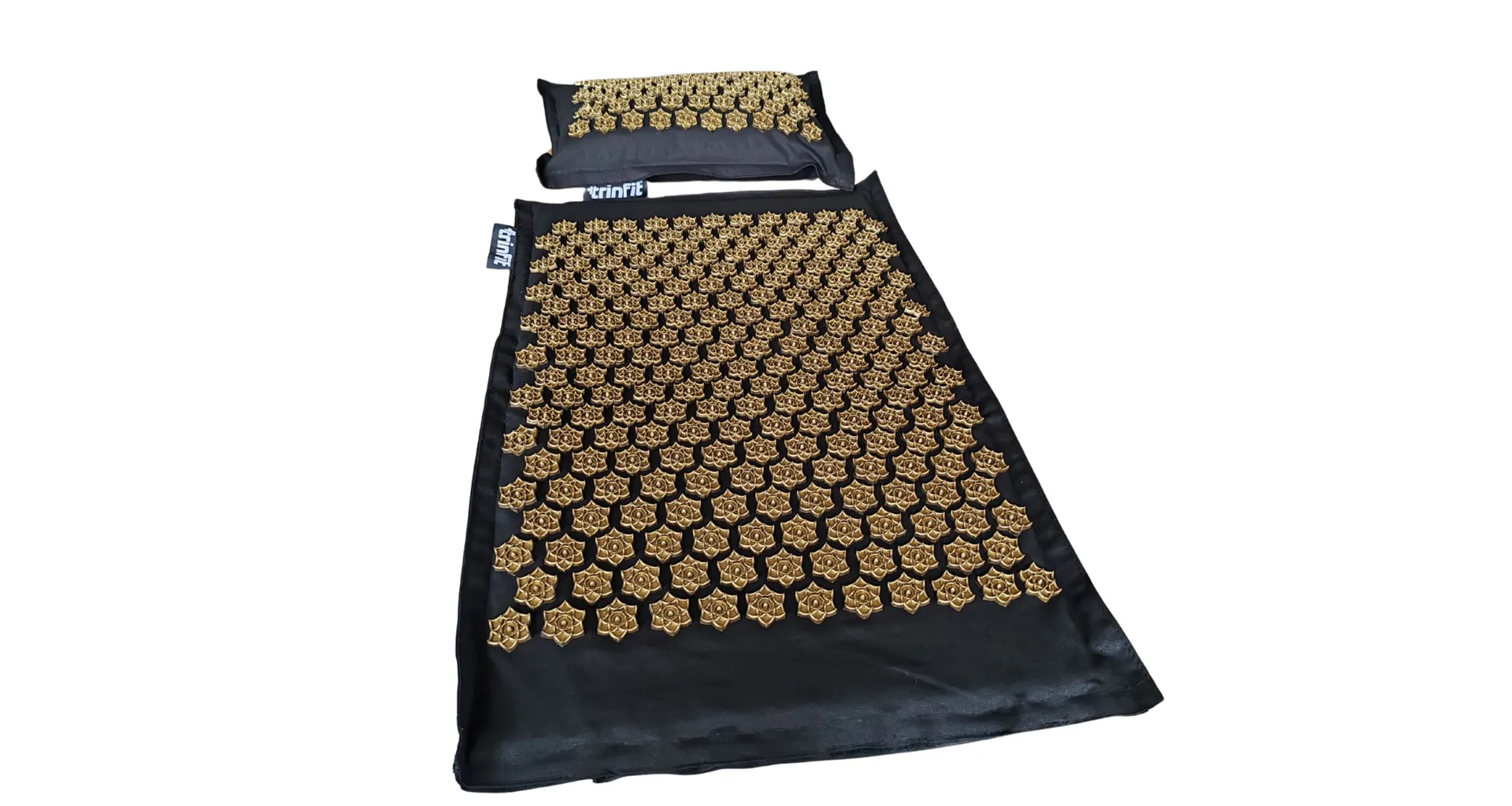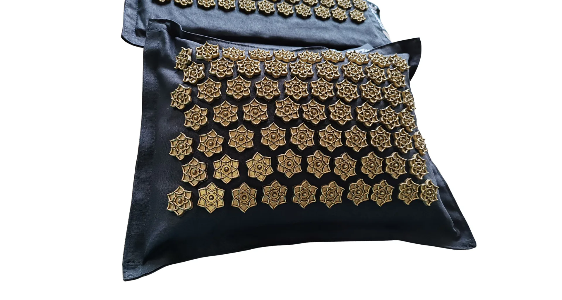 Elegantní černo-zlatý design dodává setu luxusní vzhled – černá podložka je osazena zlatými akupresurními růžicemi z odolného ABS plastu, které cíleně stimulují tlakové body na těle. Pro snadné přenášení je součástí balení i praktická látková taška.