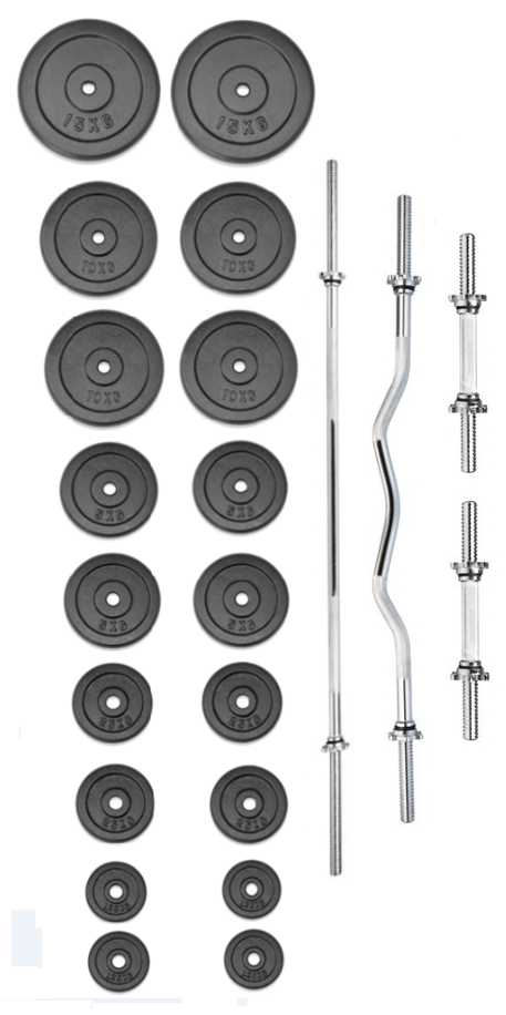 Variabilní činkový komplet sestavený z kvalitních komponentů je vynikajícím doplňkem každé domácí i komerční posilovny. Rozmanitá skladba setu zaručuje komfortní a bezpečný trénink. Součástí tohoto setu je velká obouruční hřídel na činku, zahnutá EZ hřídel, dvě jednoruční hřídele a sada litinových kotoučů, vše s vrtáním 30 mm (průměr používaný i většinou výrobců posilovacích lavic a strojů). Uvedená váha setu je včetně osy.