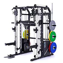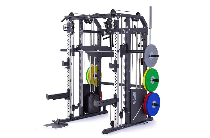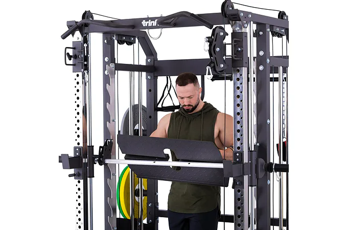 Bezpečnostní dorazy multipressu lze také umístit tak, aby vyhovovaly každému uživateli. Jakmile je adaptér nastaven do správné polohy, jednoduše vysunutím (otočením) háku osy multipressu uvolníte legpress ze zajištěné polohy, provedete zvolený cvik a znovu zasunete do zajištěné polohy.