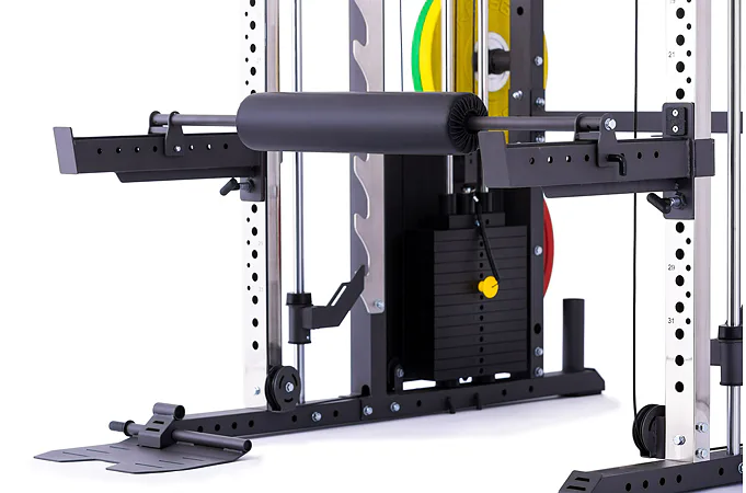 Rozšiřující adaptér TRINFIT Doraz na kolena pro CX50/60 je tvořen dlouhým pěnovým válcem na ocelové konstrukci, která se snadným způsobem pomocí zajišťovacích kolíků připevní na bezpečnostní dorazy na posilovací kleci TRINFIT Multi Smith CX50 nebo CX60.