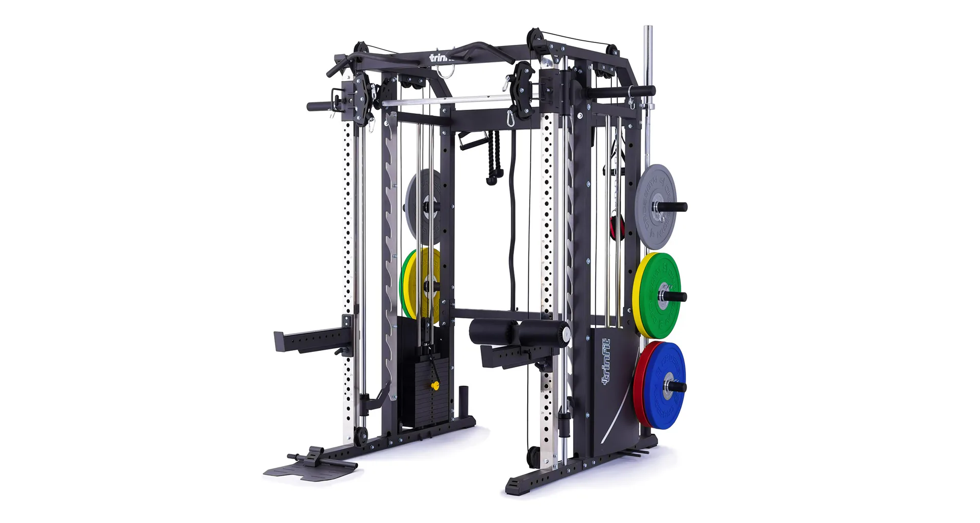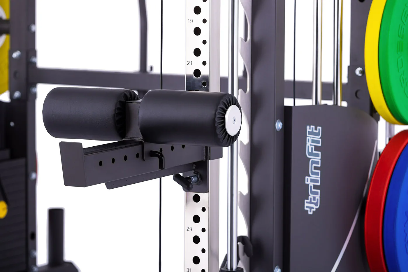 Rozšiřující adaptér TRINFIT Doraz na kolena pro CX60 je tvořen pěnovou opěrkou, která se snadným způsobem pomocí zajišťovacího kolíku připevní na bezpečnostní doraz na posilovací kleci TRINFIT Multi Smith CX60.