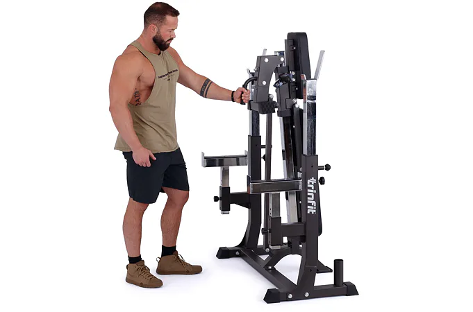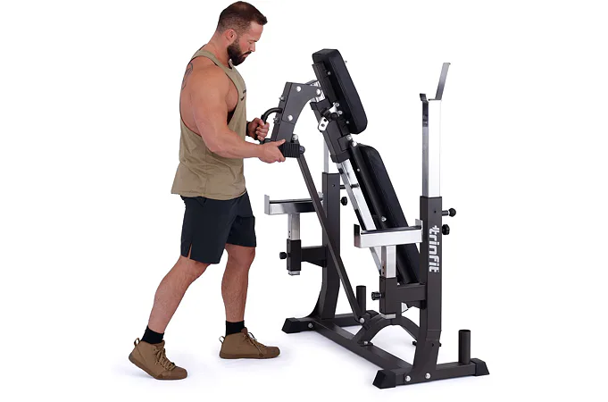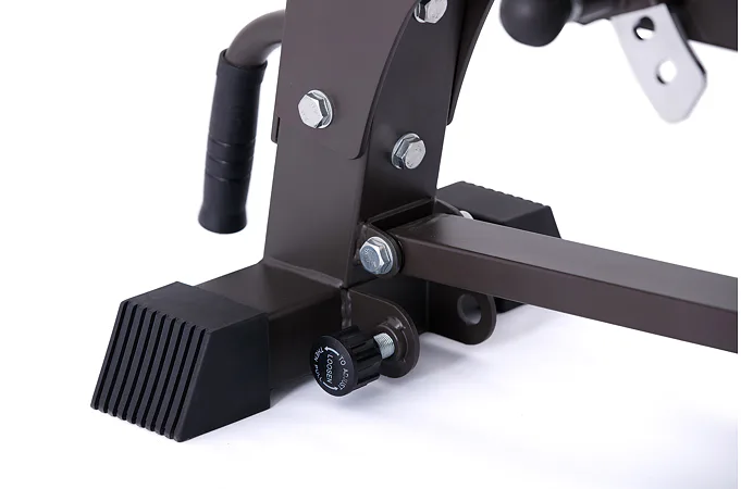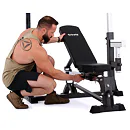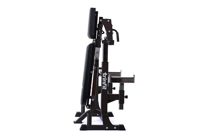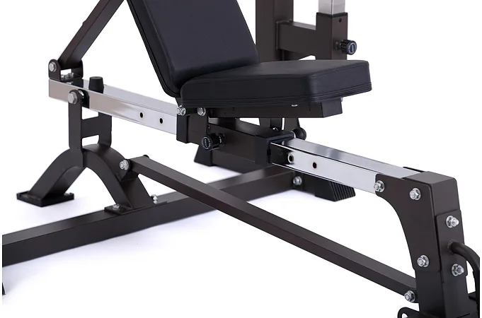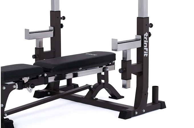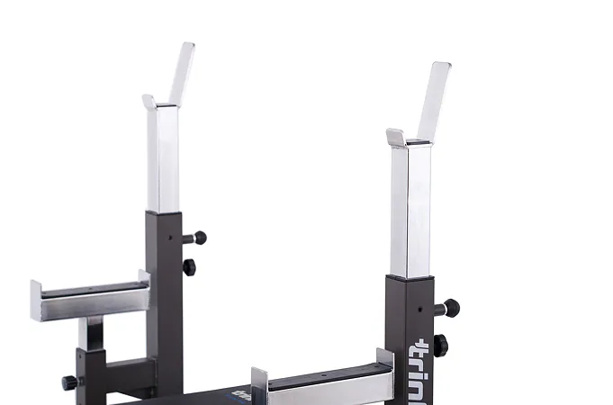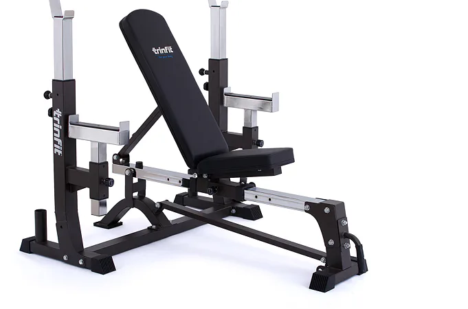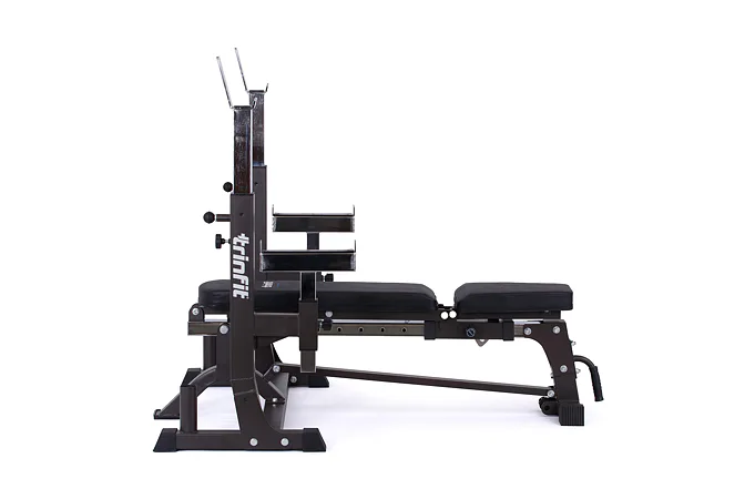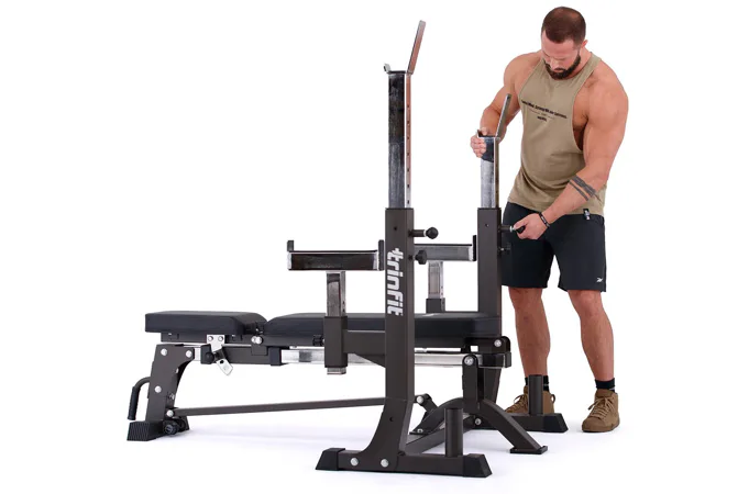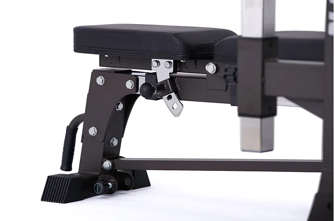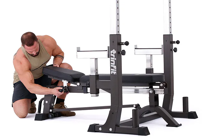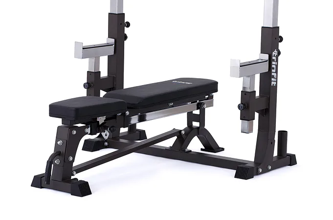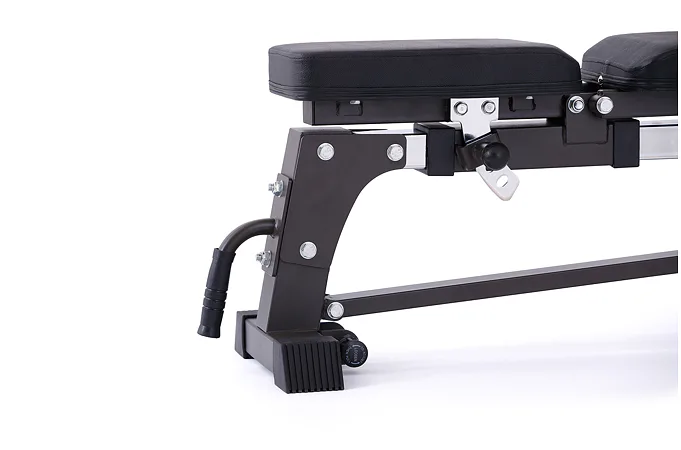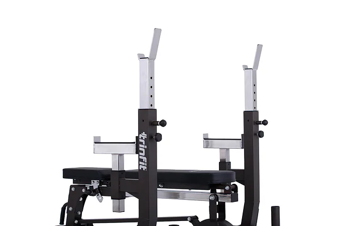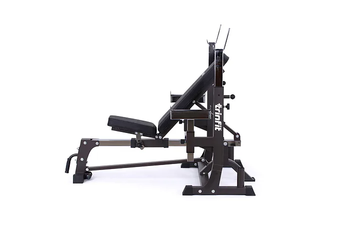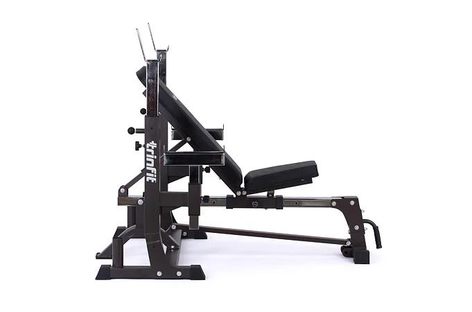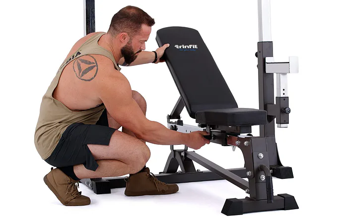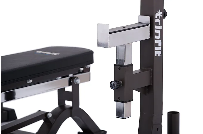 TRINFIT F7 Pro Benchpress má unikátní mechanismus nastavení lavice. Ta je totiž umístěná na kolejnici, která je opatřena 9 otvory, pro 9 poloh lavice. Lavici lze tedy položit do úplné roviny (pro benchpress), ale i do sedu (pro tlaky na ramena s velkou činkou). Pokud chcete procvičit prsa z úhlu, pak vám bude pravděpodobně vyhovovat poloha lavice něco mezi sedem a lehem.