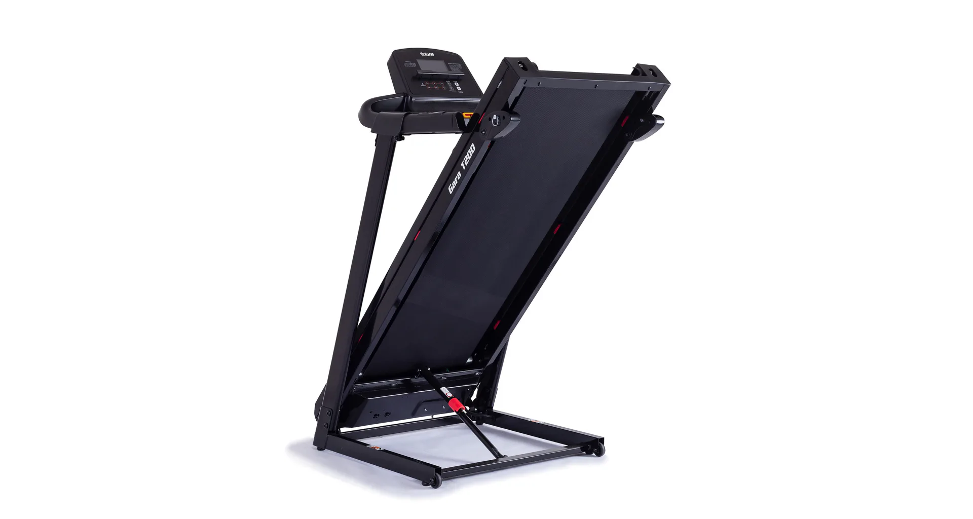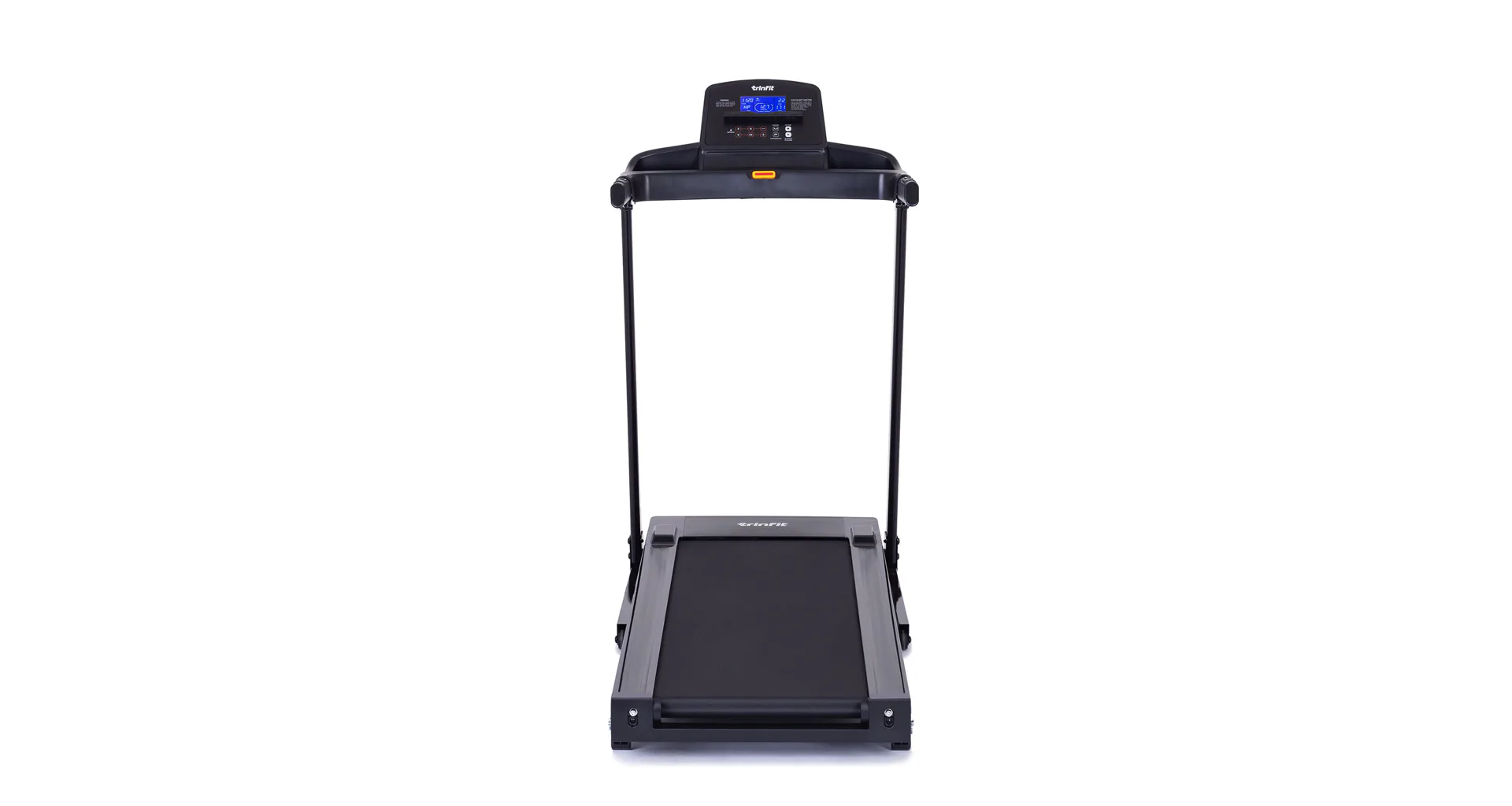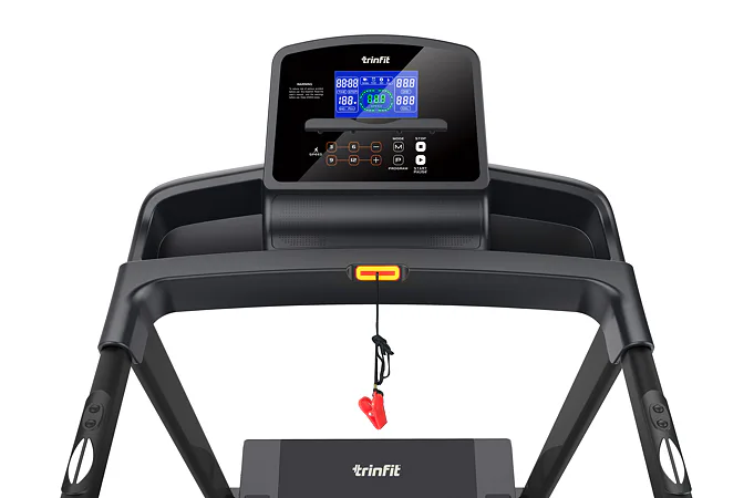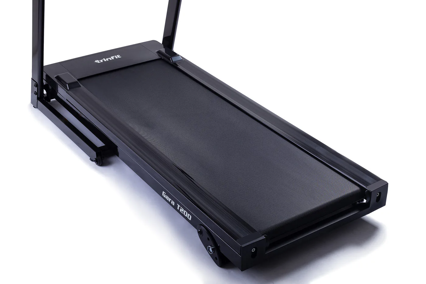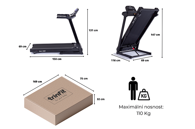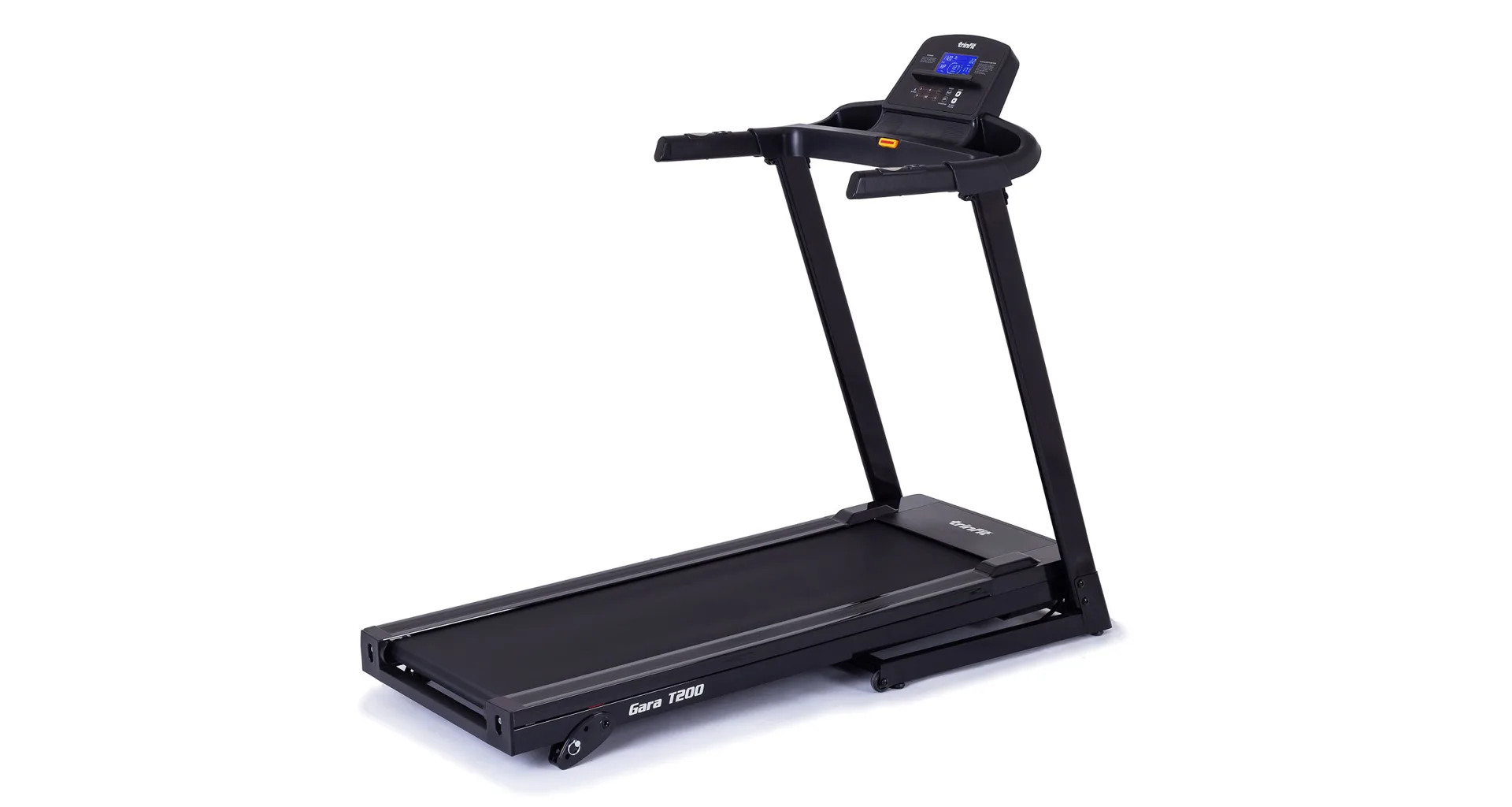 Běžecký pás TRINFIT Gara T200 disponuje počítačem s LCD displejem, držákem na lahev, senzory pro měření tepové frekvence a transportními kolečky. Po tréninku stroj snadno a rychle složíte.