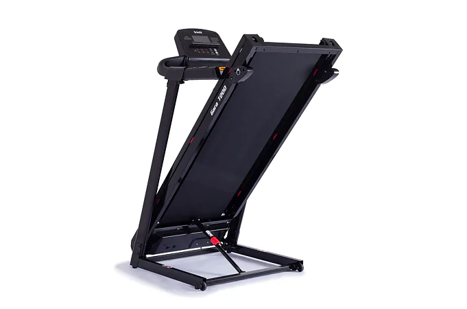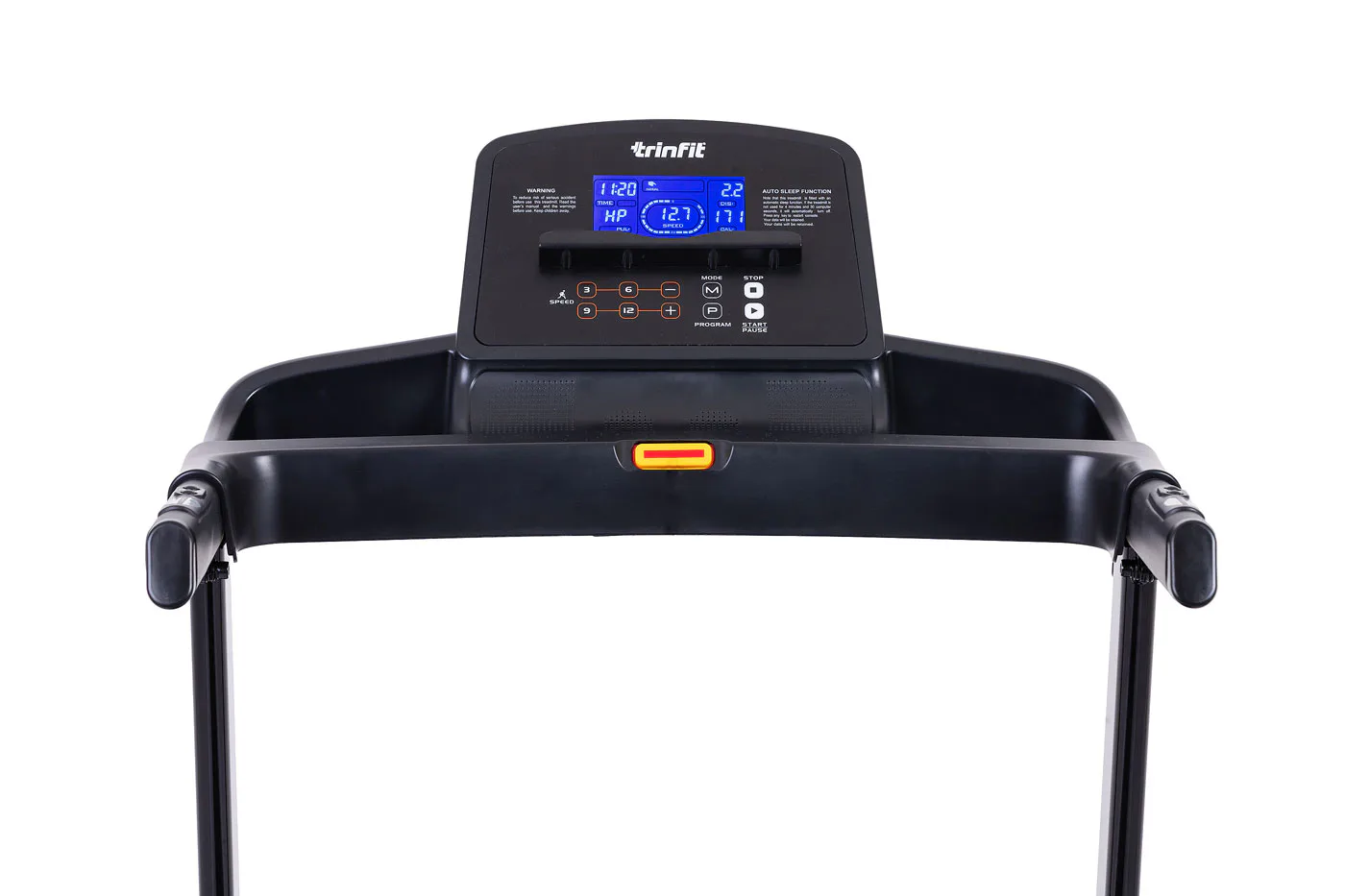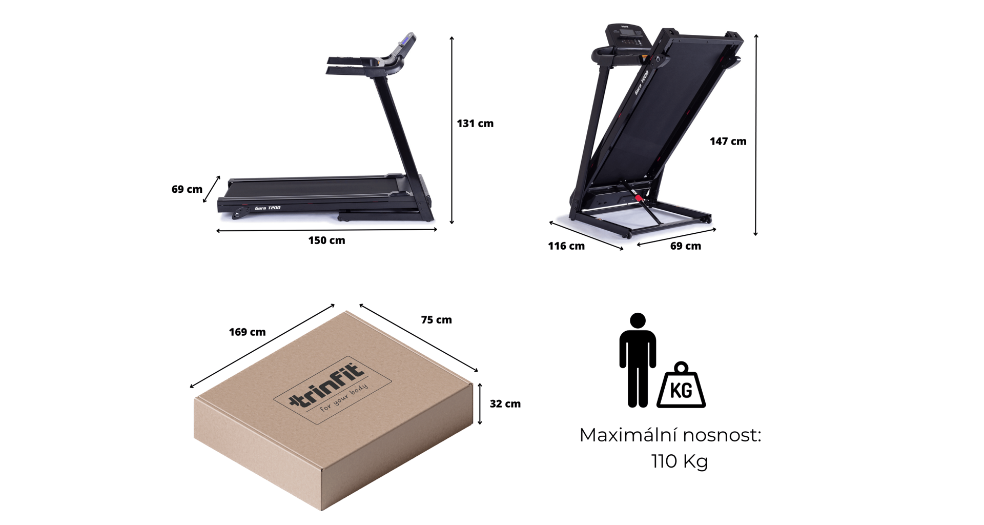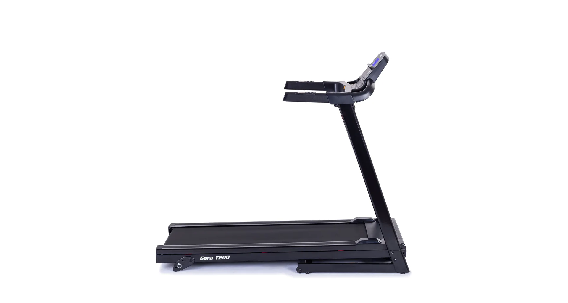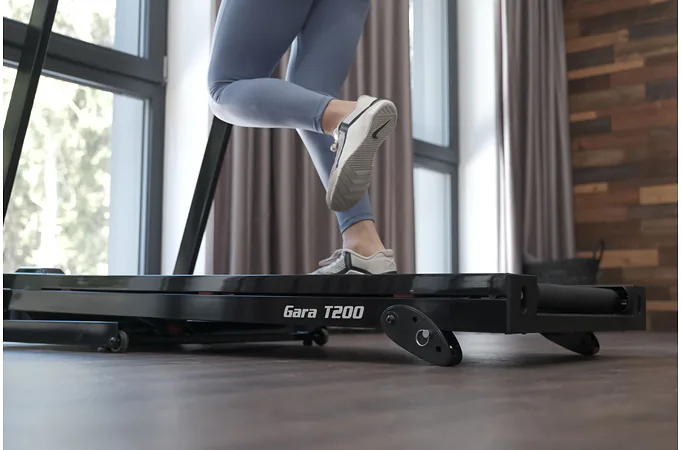 Běžecký pás TRINFIT Gara T200 disponuje počítačem s LCD displejem, držákem na lahev, senzory pro měření tepové frekvence a transportními kolečky. Po tréninku stroj snadno a rychle složíte.