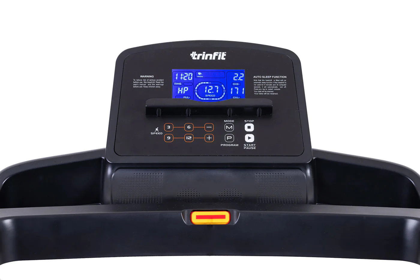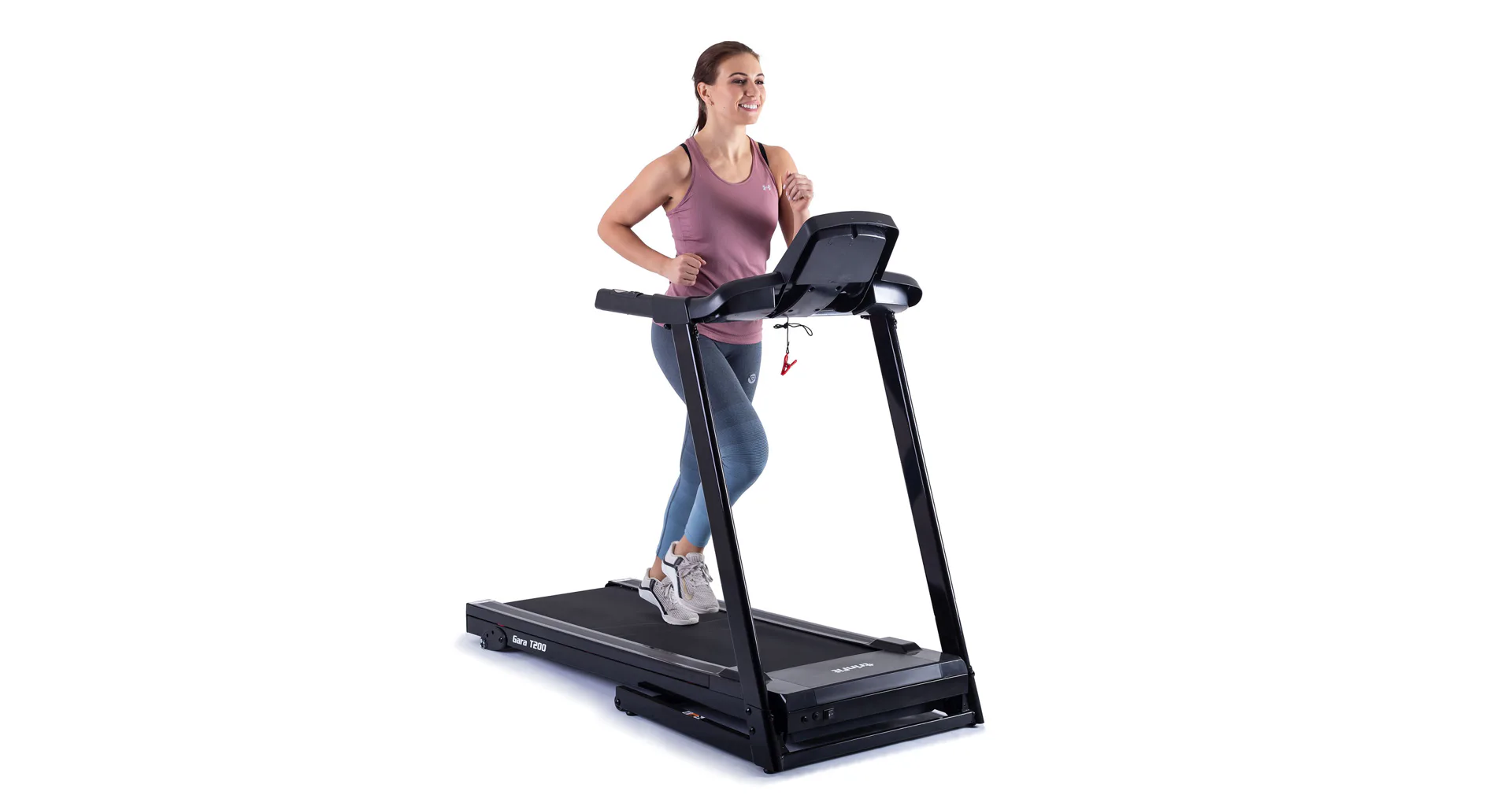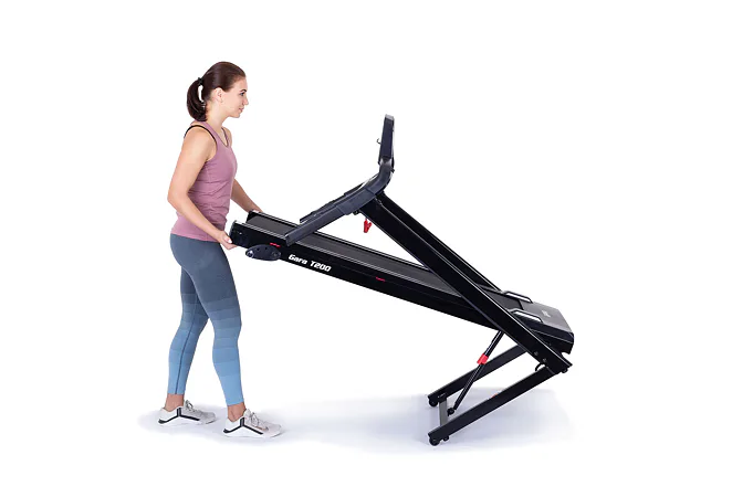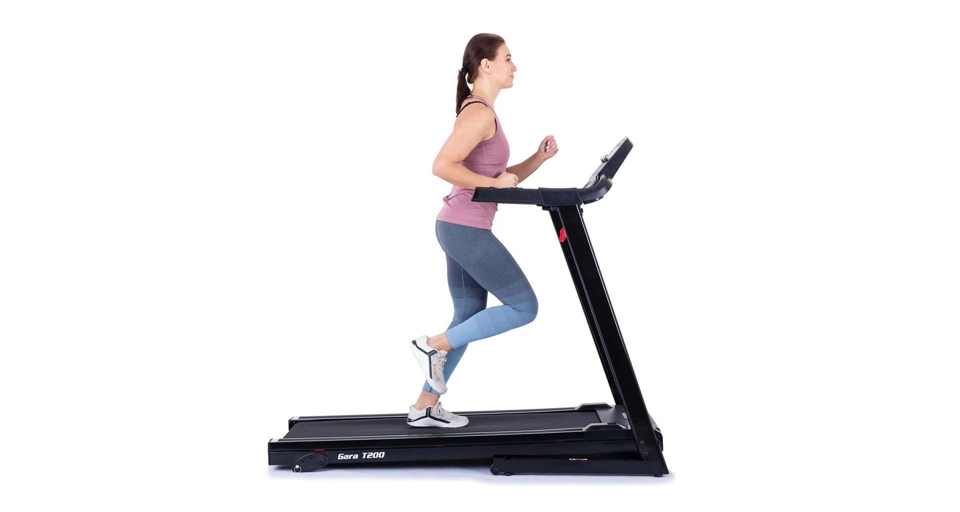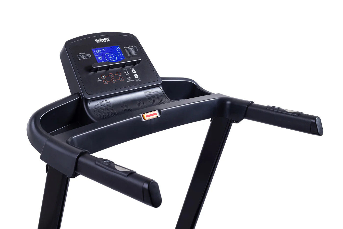 Běžecký pás TRINFIT Gara T200 disponuje počítačem s LCD displejem, držákem na lahev, senzory pro měření tepové frekvence a transportními kolečky. Po tréninku stroj snadno a rychle složíte.