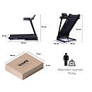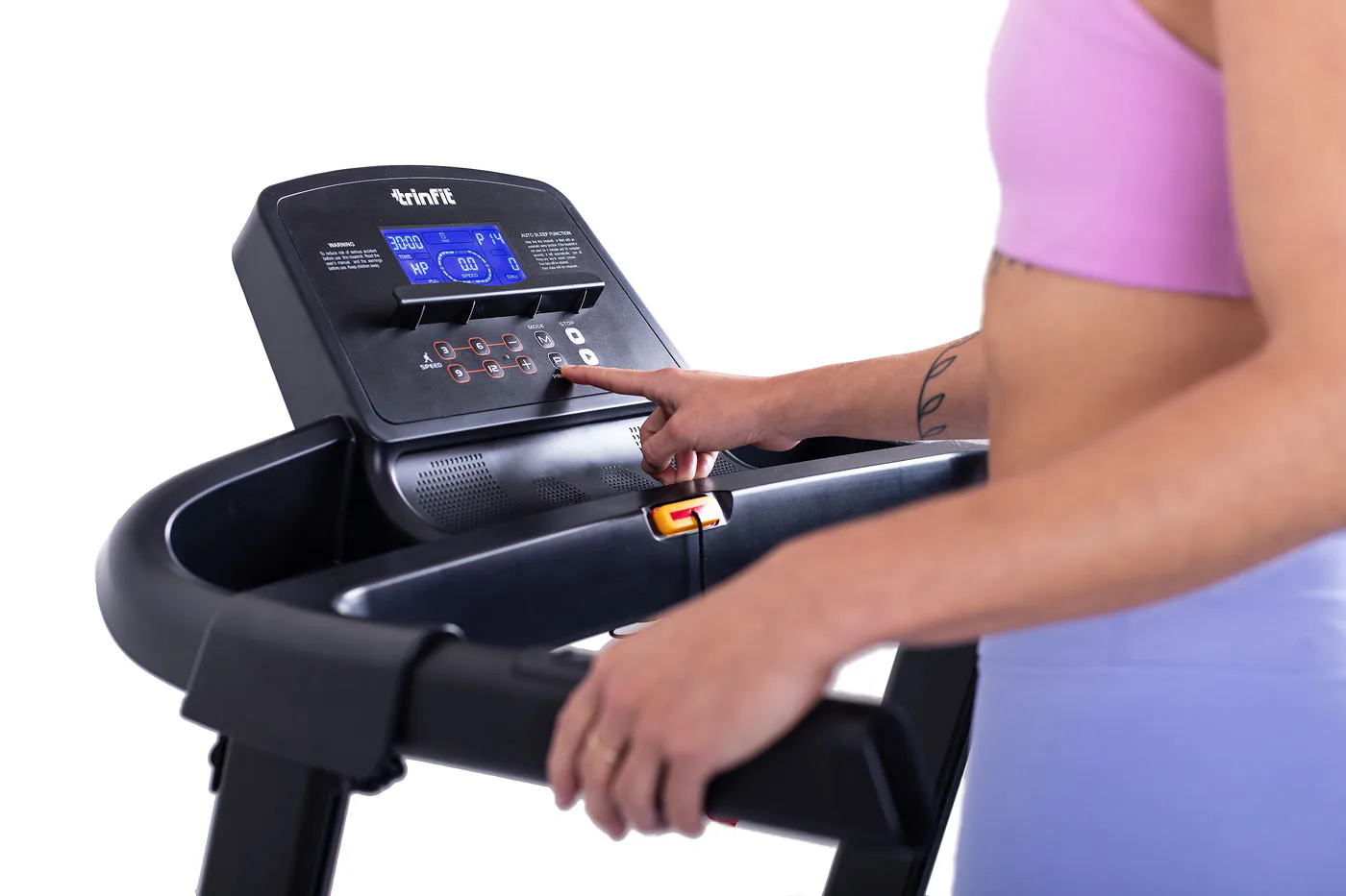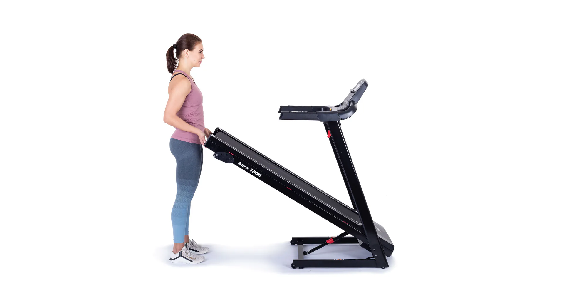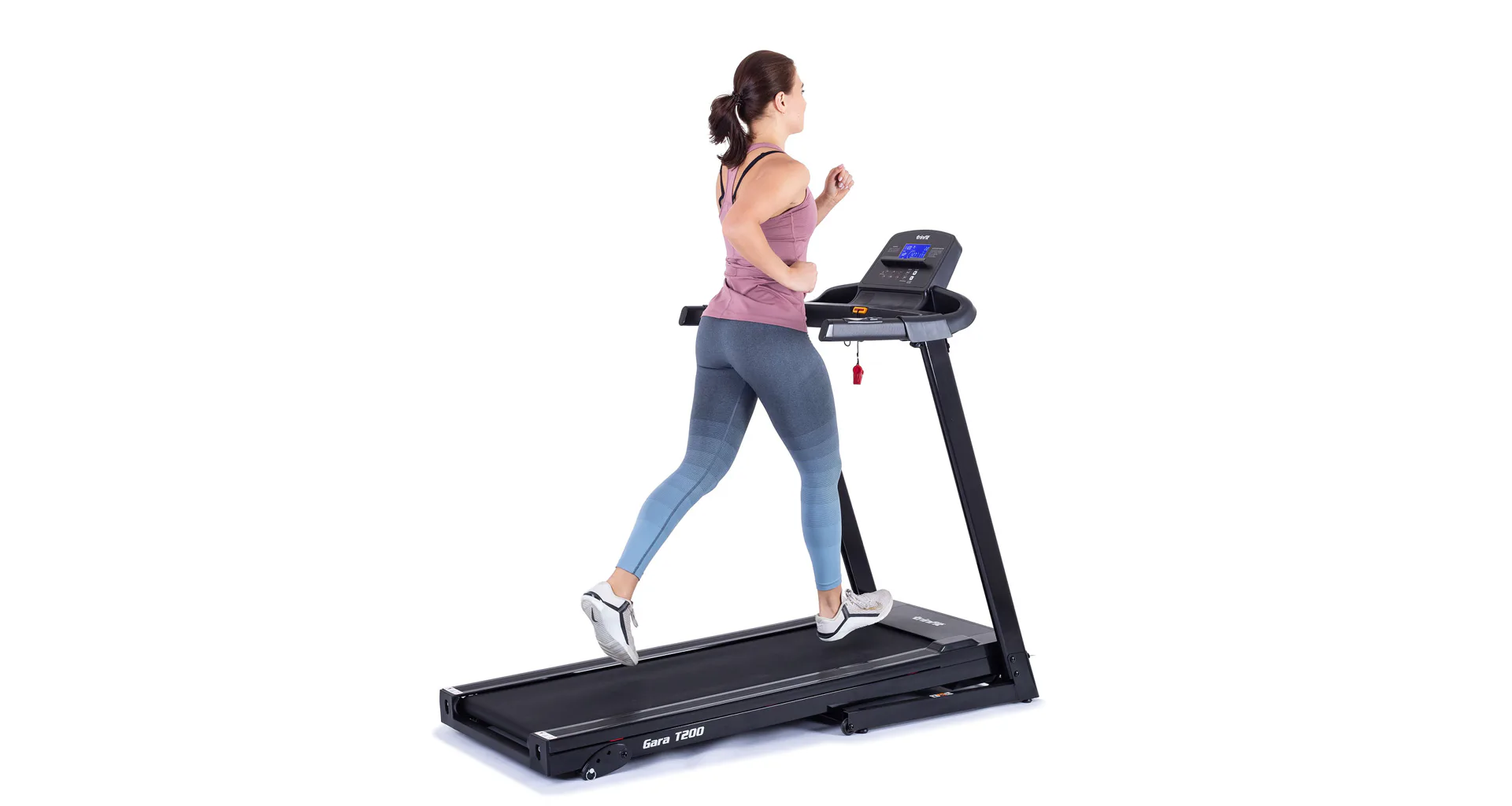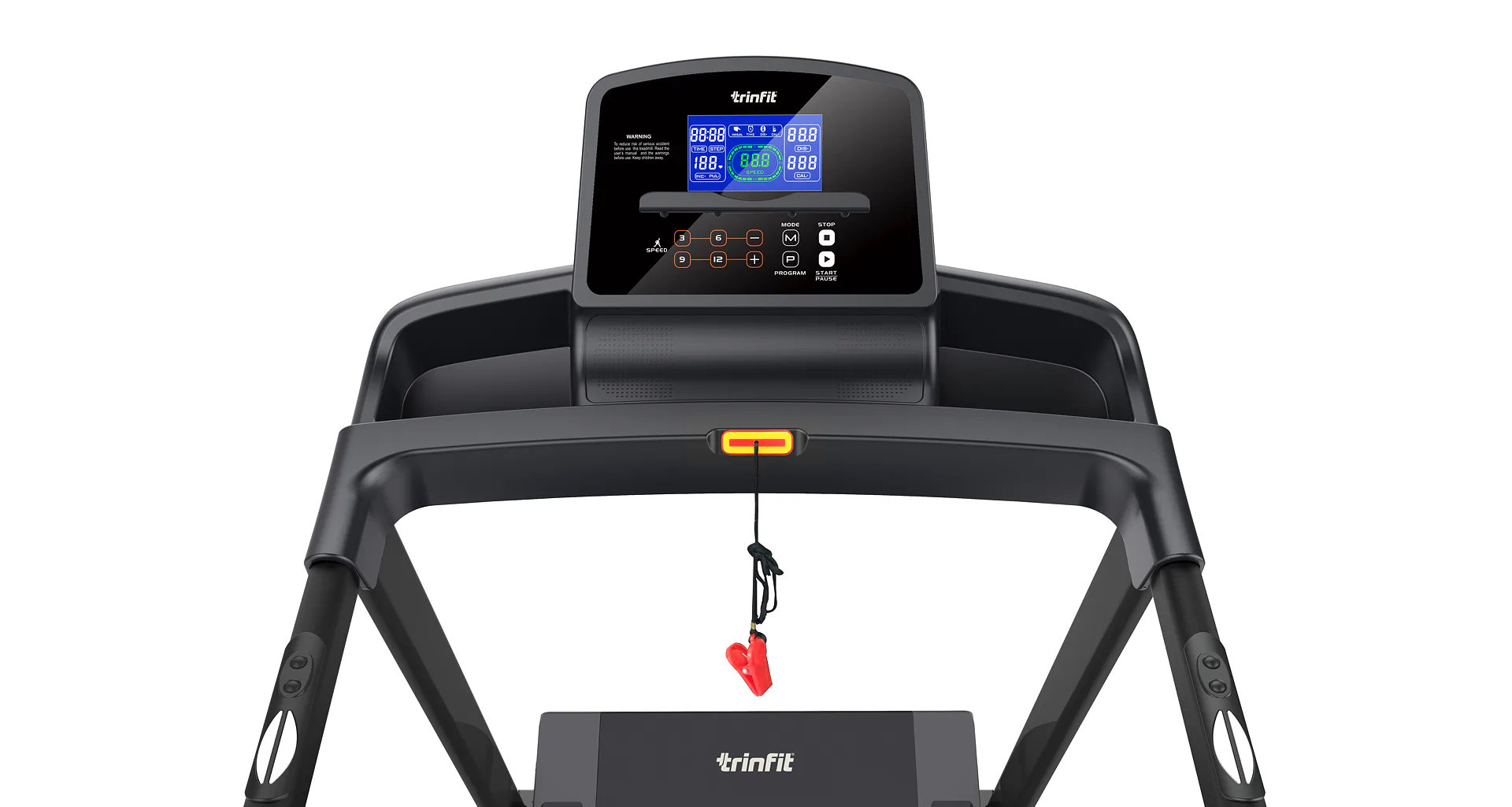 Běžecký pás TRINFIT Gara T200 disponuje počítačem s LCD displejem, držákem na lahev, senzory pro měření tepové frekvence a transportními kolečky. Po tréninku stroj snadno a rychle složíte.