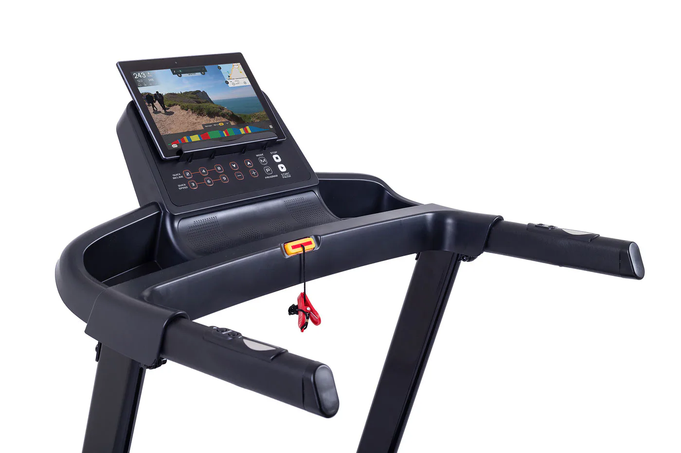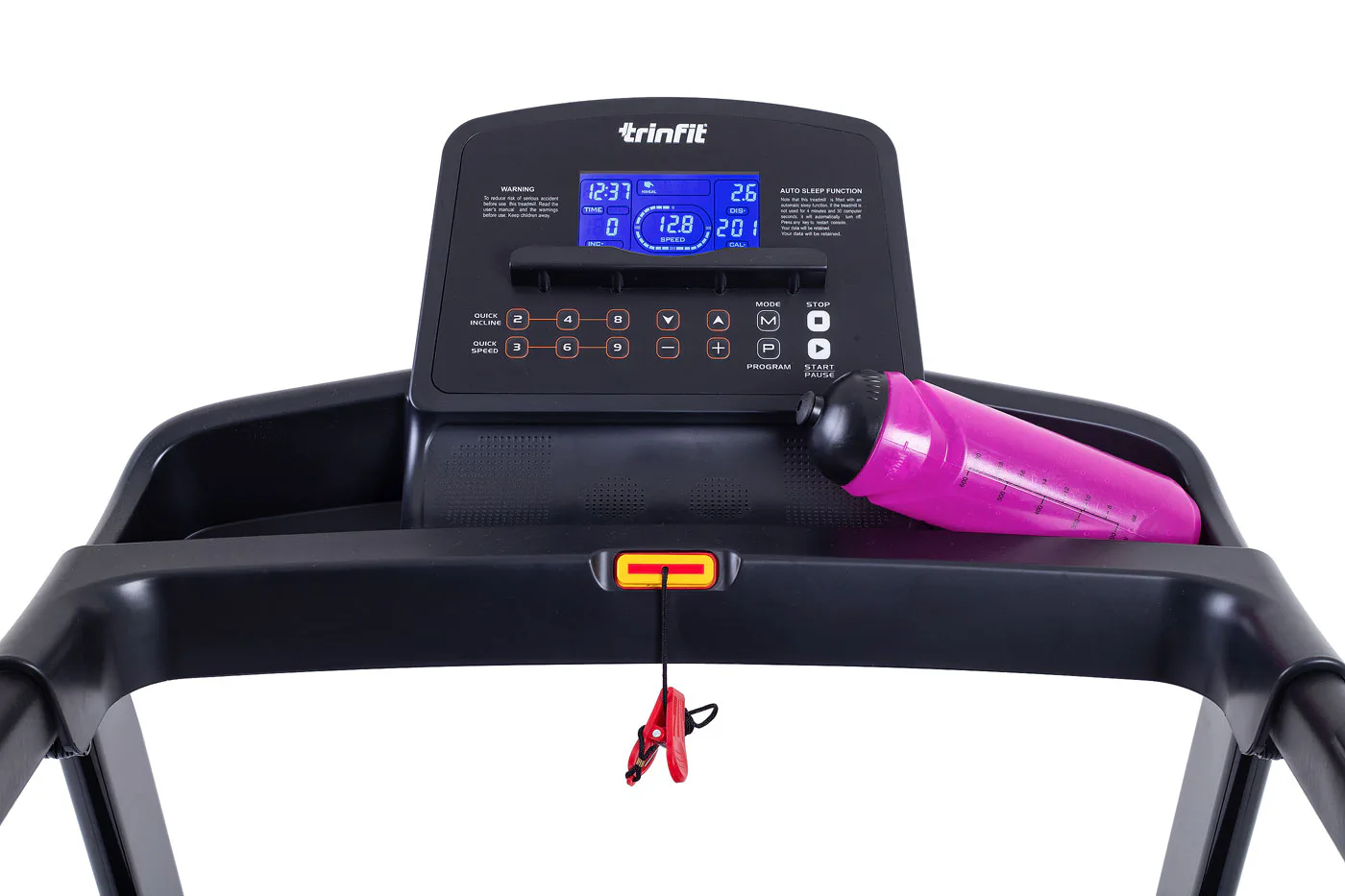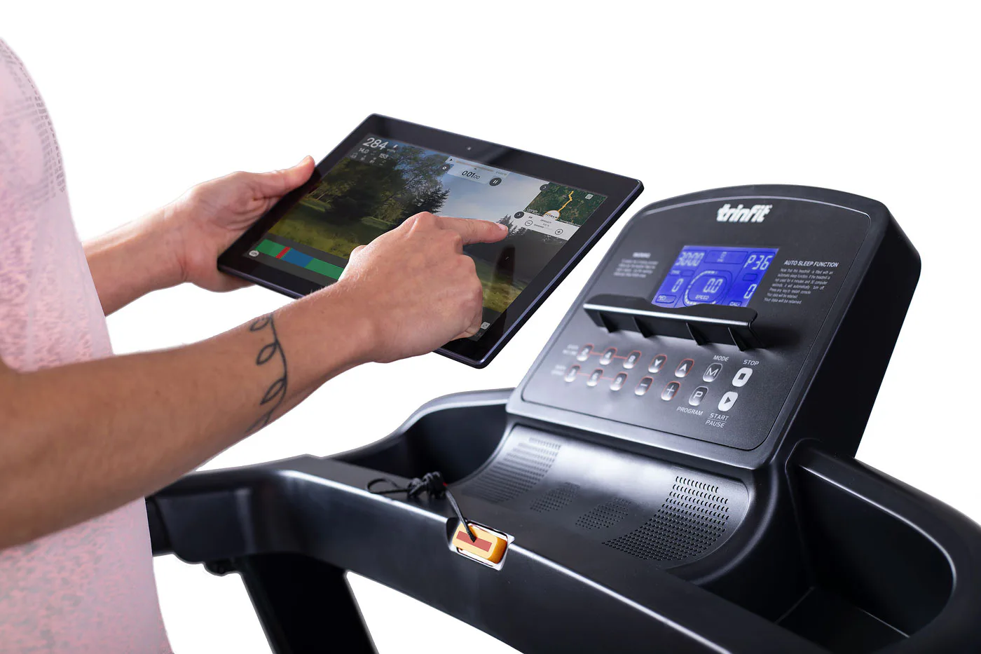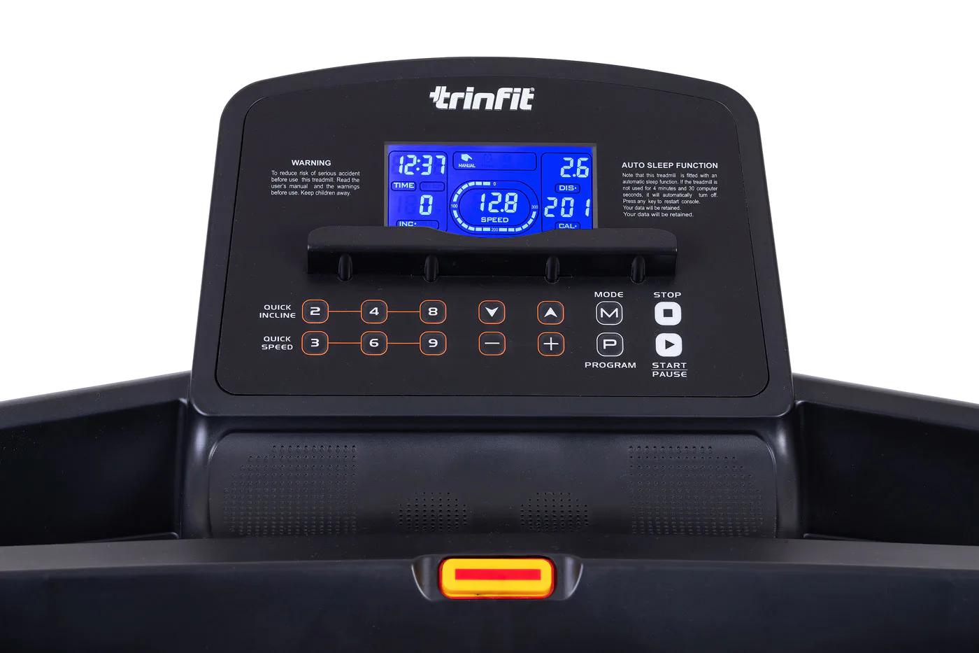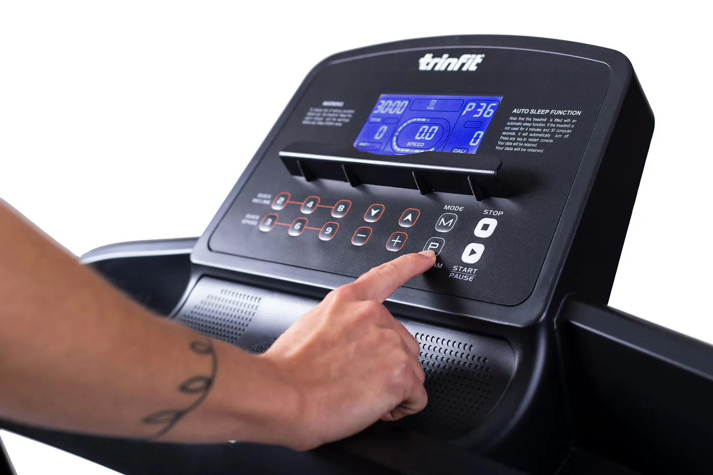 TRINFIT Gara T250 nabízí přehledný, podsvětlený LCD displej s bohatou programovou nabídkou pro efektivní a zábavný trénink. Umožní vám sledovat váš trénink v reálném čase pomocí dat monitorujících vaši rychlost, čas, vzdálenost, spálené kalorie a srdeční frekvenci.