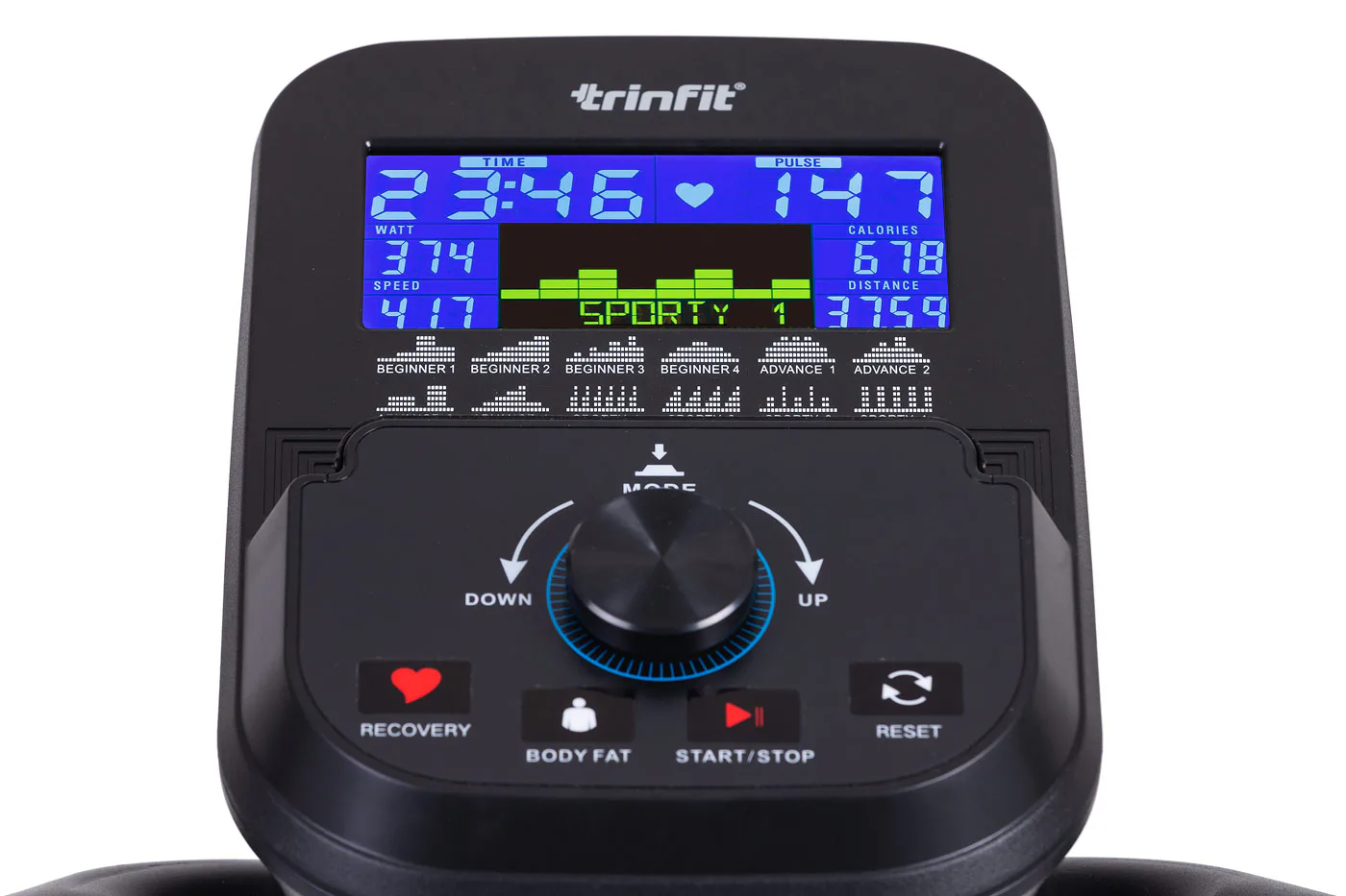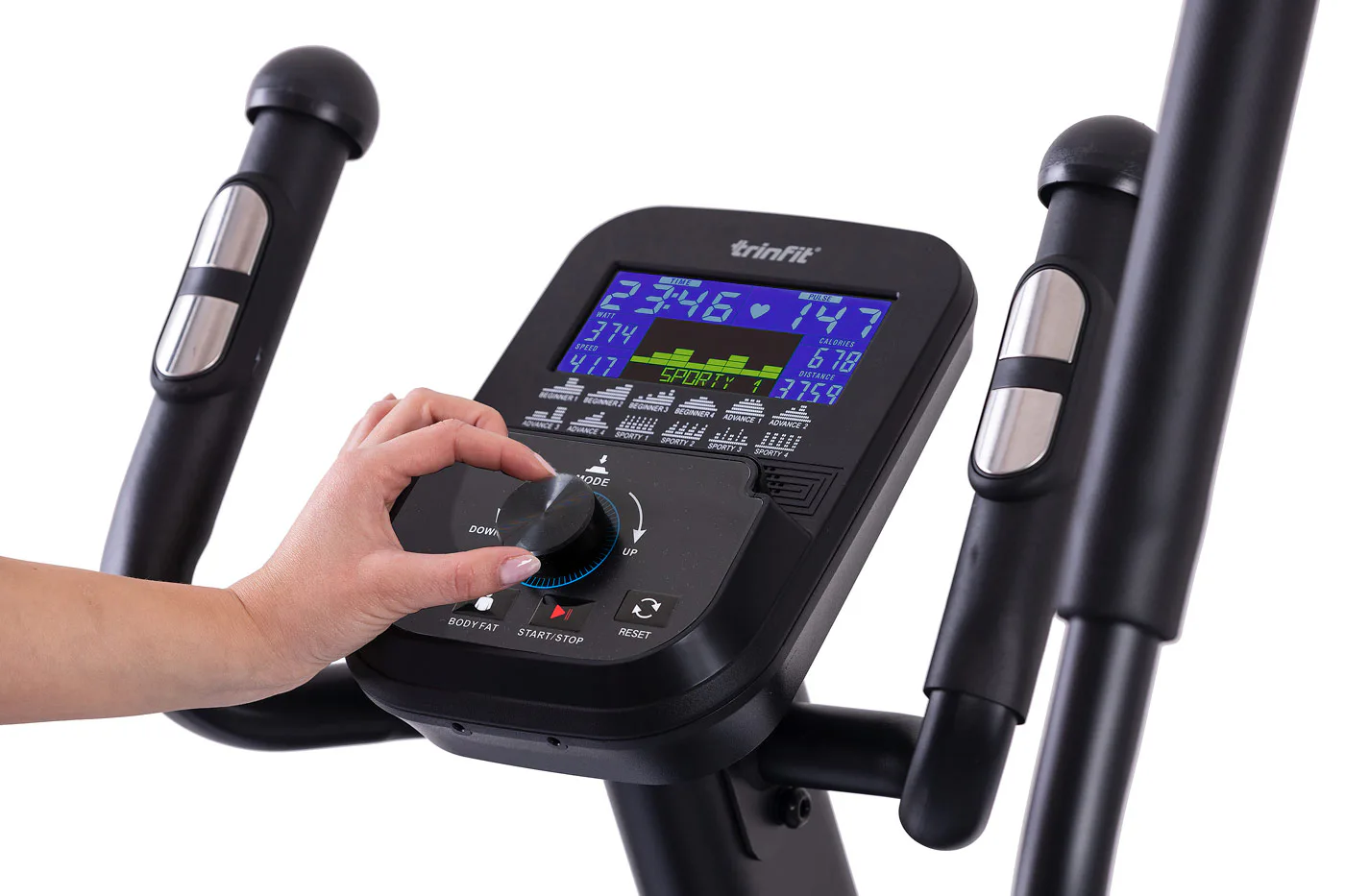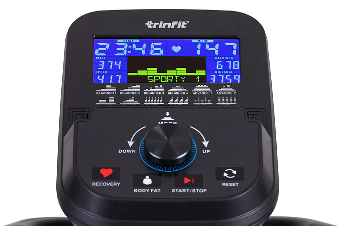 Pro maximální efektivitu cvičení nabízí TRINFIT Monta C550i různé programy zaměřené na měření a regulaci tepové frekvence, včetně HRC programů a funkce Body Fat. LCD displej přehledně zobrazuje klíčové tréninkové údaje, jako jsou čas, vzdálenost, rychlost, spálené kalorie a srdeční frekvence.