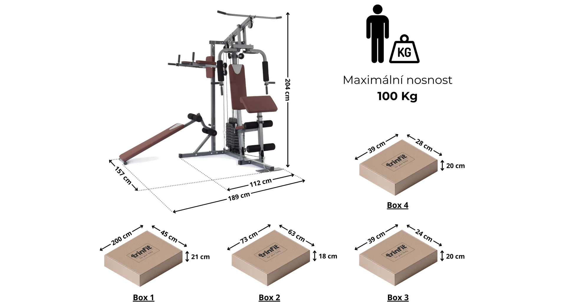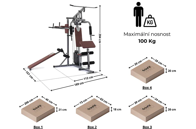 Posilovací věž TRINFIT Multi Gym MX4 je multifunkční zařízení, které vám na velmi malém prostoru umožní procvičení více než 45 různých cviků. Na stroji mohou současně cvičit 2 osoby, je určena pro efektivní procvičení celého těla. Věž je vhodná pro uživatele, kteří si chtějí na relativně malém prostoru zacvičit, vytvarovat postavu a nabrat svalovou hmotu. Pro efektivní procvičení břišních svalů je posilovací věž TRINFIT Multi Gym MX4 na boku doplněna bradly s přednožováním a šikmou lavicí s možností polohování. Závaží je řešeno pomocí klasických cihliček, díky zpřevodování umožňuje na vybraných adaptérech cvičení s vahou až 60 kg (viz indexy přenosu síly níže). Nastavení požadované váhy je snadné, rychlé a bezpečné i pro začátečníky.