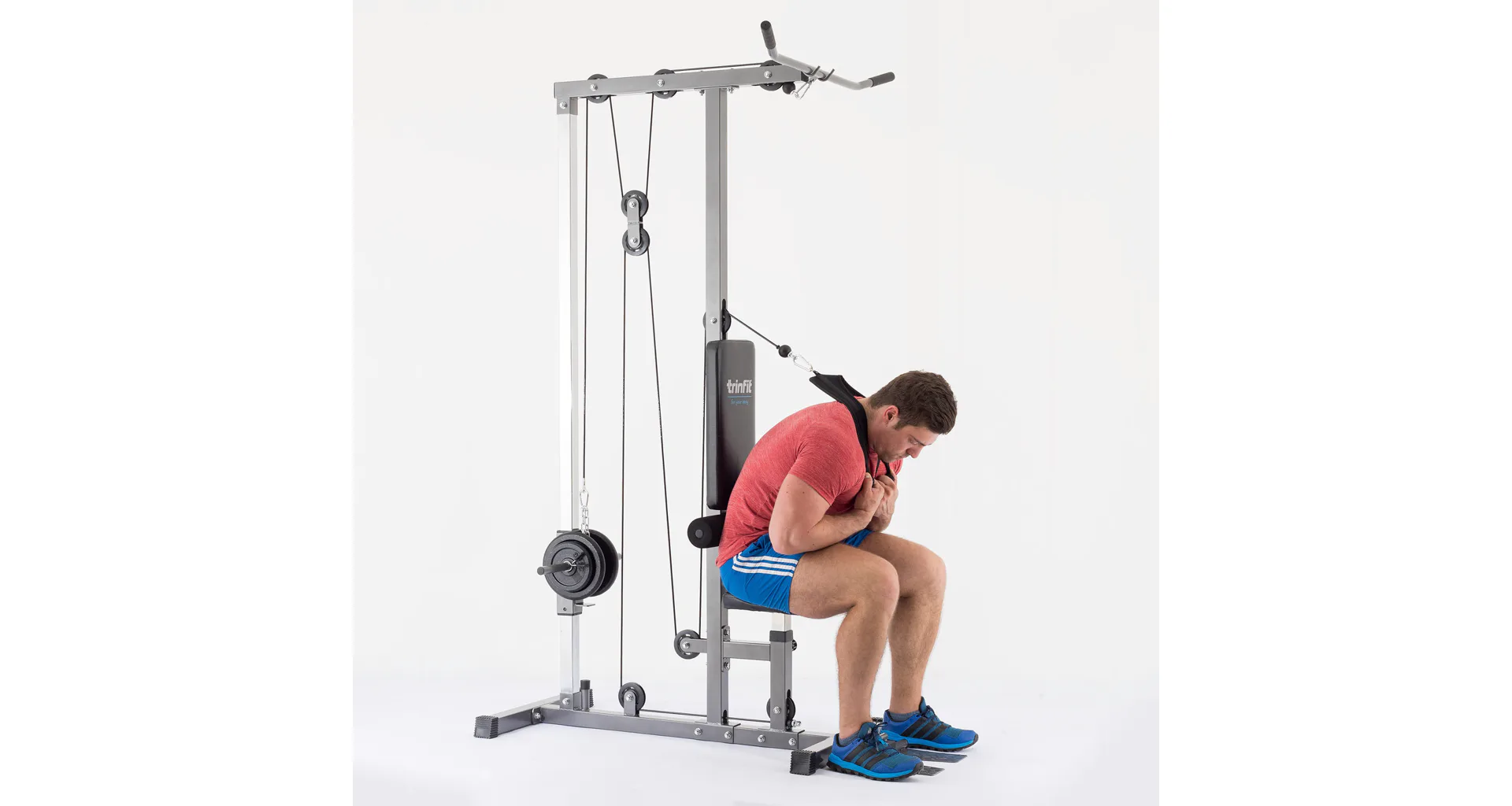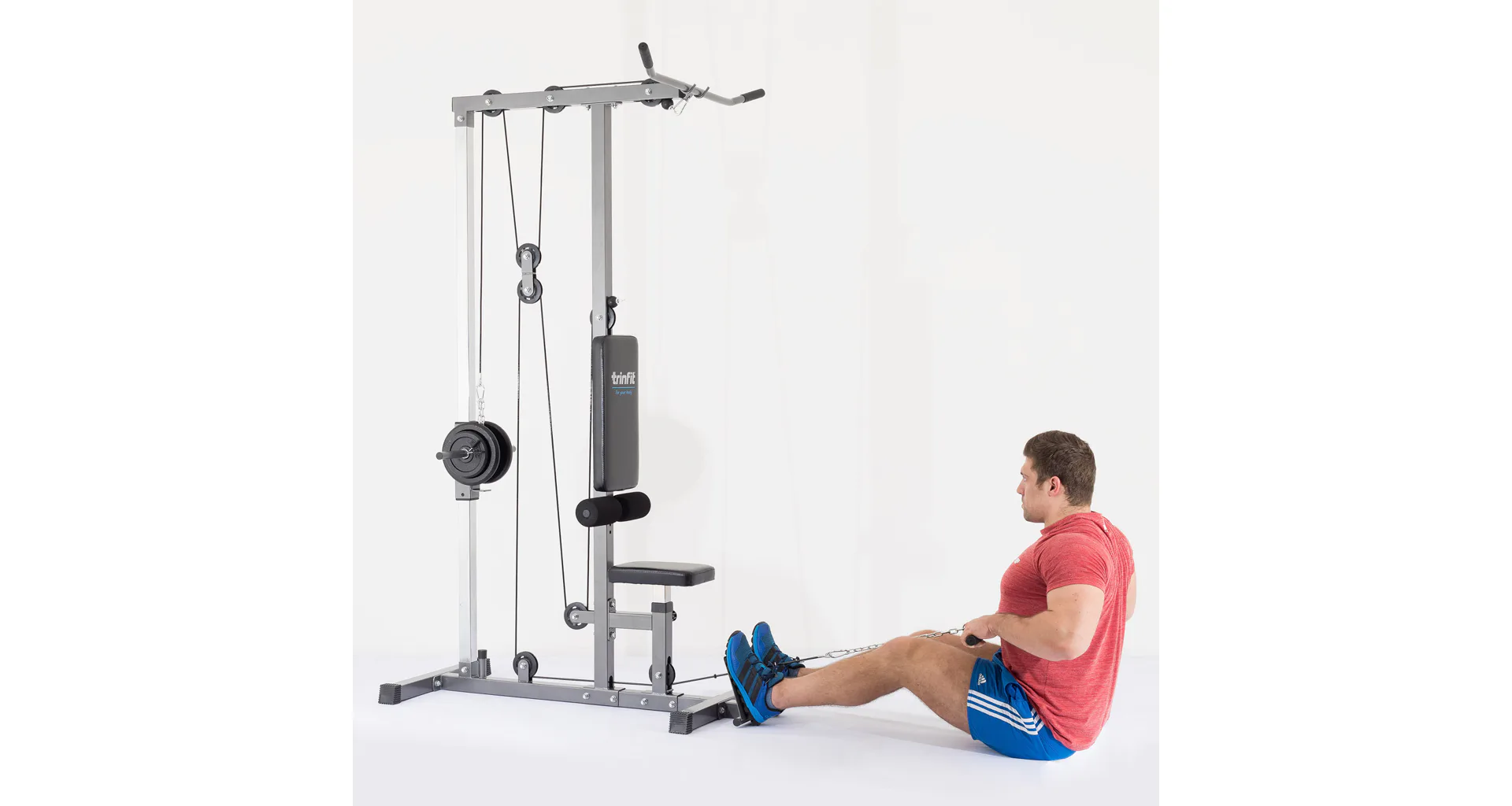 Výhodou kladkostroje TRINFIT je naprostá plynulost pohybu všech kladek daná nylonovými kladkami s ložisky a převody ocelovým lankem potaženým speciální vrstvou. Ať už se bavíme o spodní kladce, kladce horní či tricepsové, pojezdy jsou zcela plynulé a nevydávají žádný hluk. Robustní a stabilní konstrukce z ocelových profilů 50 x 50 mm je opatřena kvalitním práškovým lakem, který slouží zároveň i jako ochrana proti poškrábání, či korozi. Polohovatelný sedák, polohovatelné kolenní válce pro zapření nohou i opěrky nohou pro veslování zvyšují jistotu a komfort při cvičení. Opěrky kolen jsou osazeny pěnovými válci, zádová opěrka pak kvalitním čalouněním. Adaptéry jsou na koncích opatřeny protiskluzovým gumovým materiálem, který napomáhá pevnému úchopu.