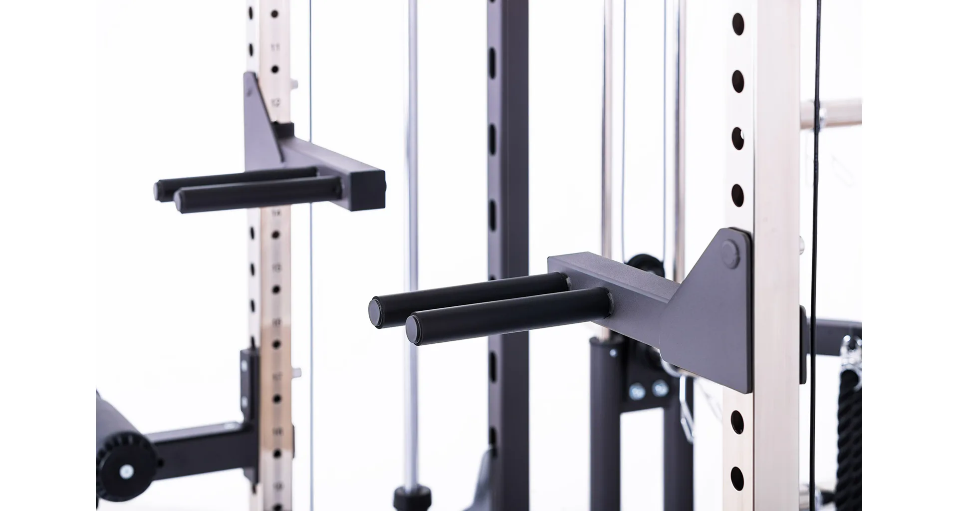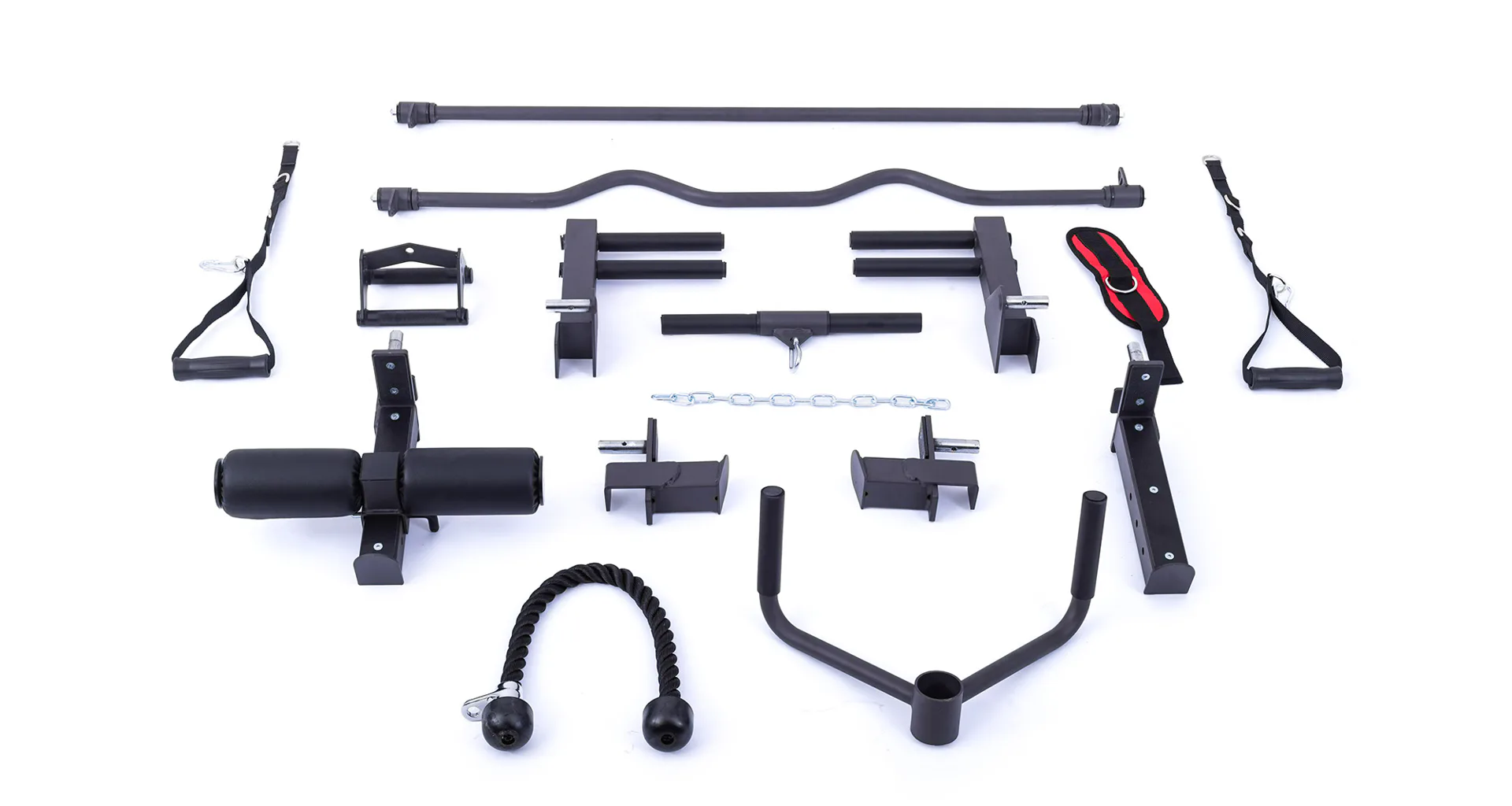 Součástí posilovací klece TRINFIT Multi Smith CX50 je velké množství adaptérů: jednoruční adaptéry, dlouhý rovný adaptér, dlouhý EZ adaptér, tricepsové lano, kotníkový adaptér, V-adaptér pro veslování, krátký rovný adaptér, háky na velkou osu, bezpečnostní dorazy a adaptéry na tricepsové kliky tzv. dipy.