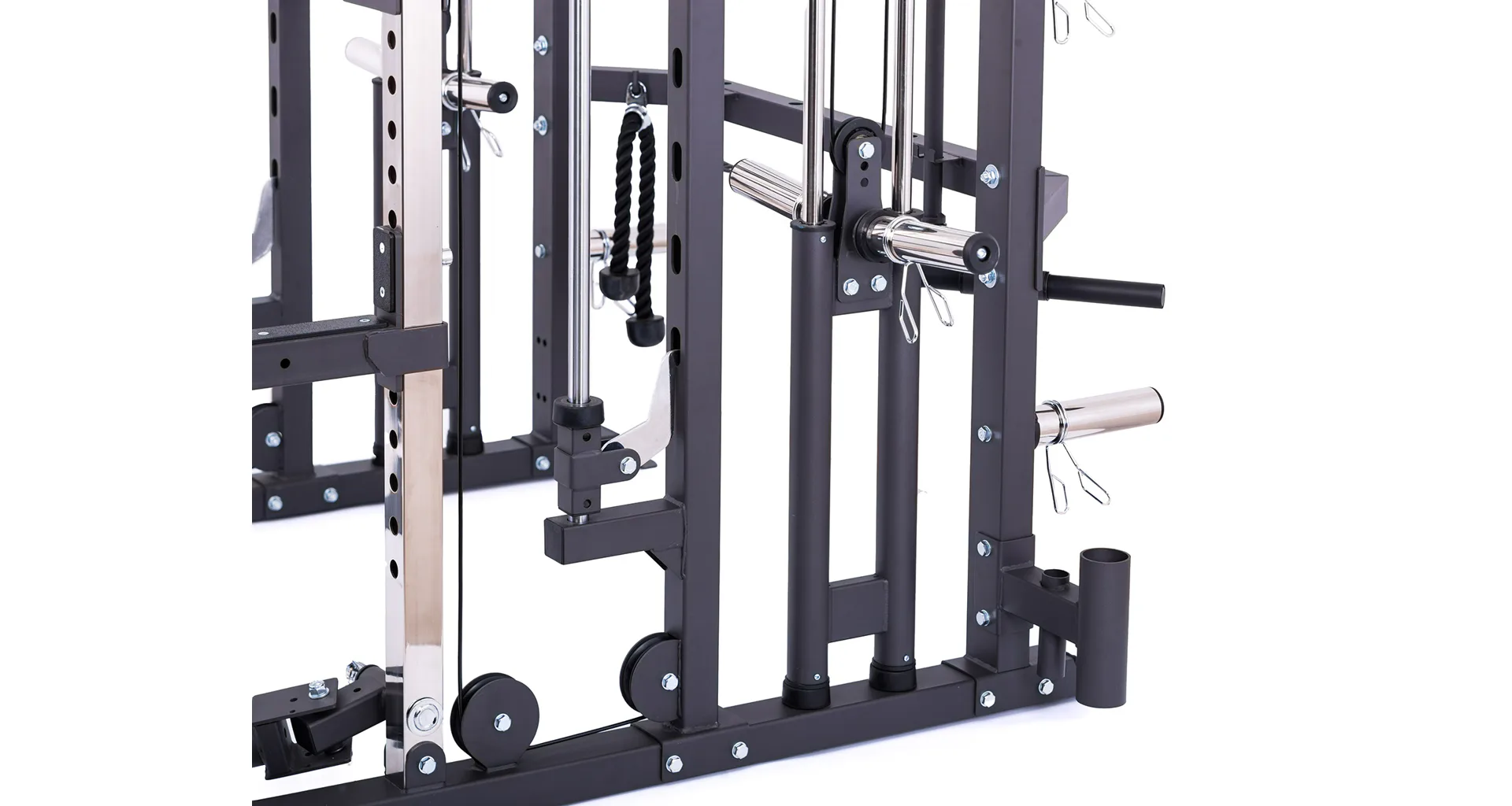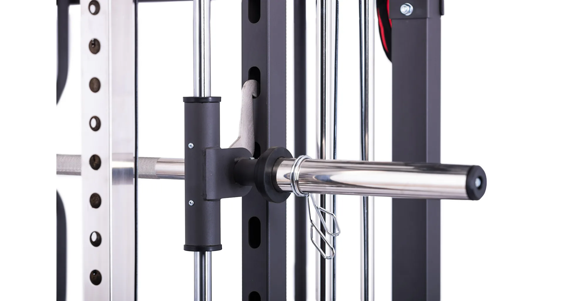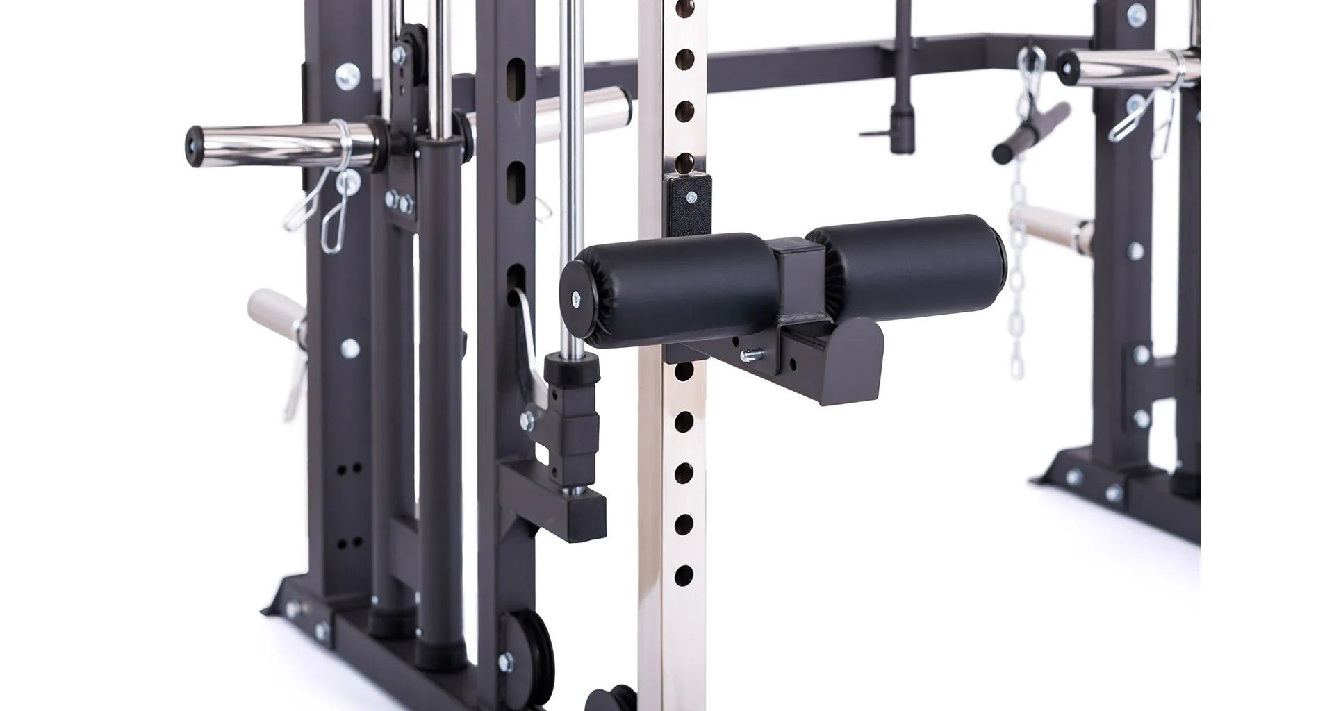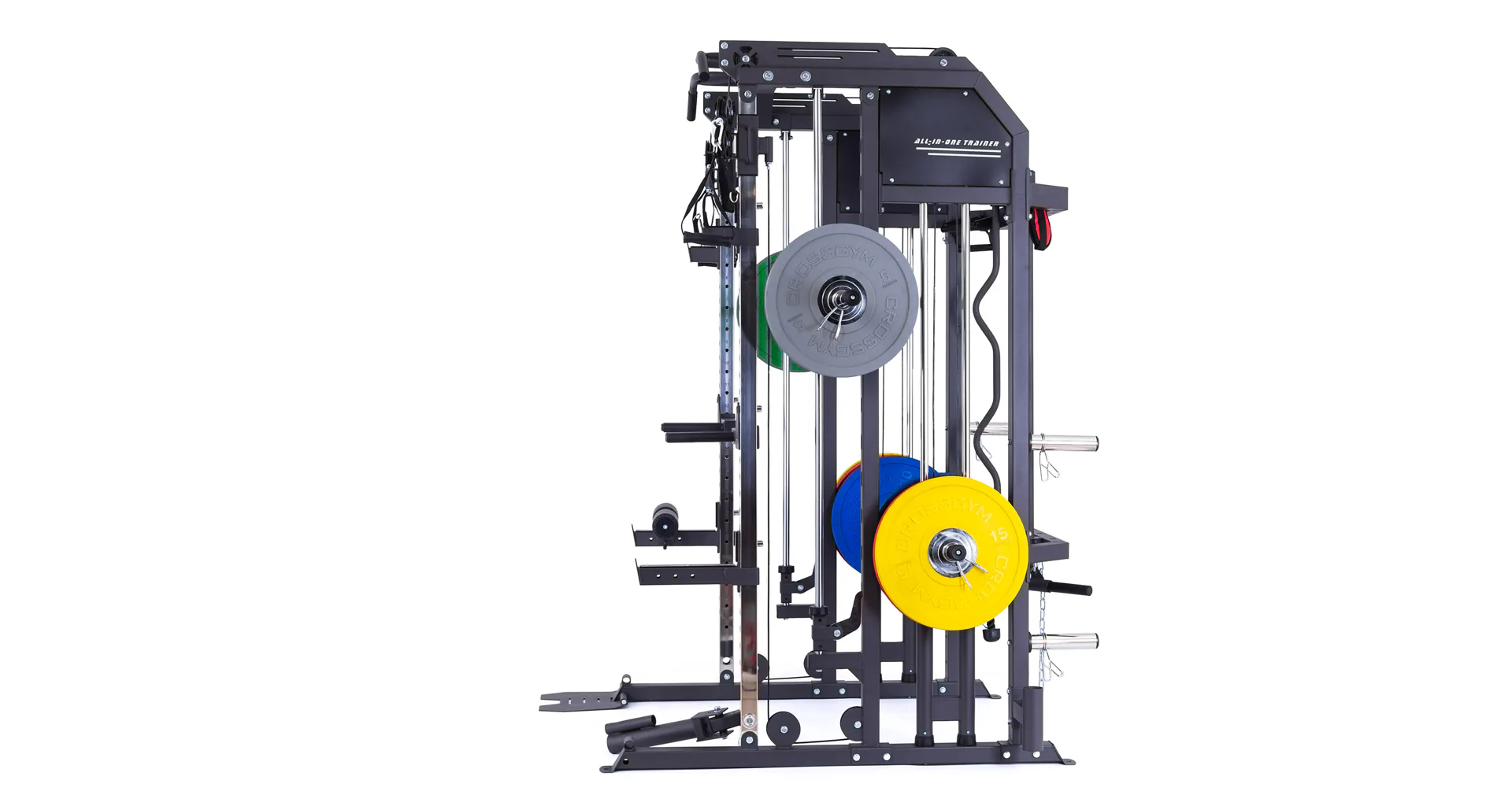 Model Multi Smith CX50 vyniká bezkonkurenční přirozenou ergonomií pohybu kladek, adaptérů a multipressu. Všechny kladky a multipress jsou osazeny kvalitními průmyslovými ložisky s mechanismem pro dopínání. Multipress jako závaží také využívá kotouče s průměrem 25 mm nebo 50 mm a pro odložení kotoučů jsou po stranách klece celkem 4 odkládací trny.