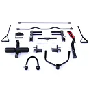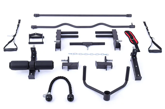 Součástí posilovací klece TRINFIT Multi Smith CX50 je velké množství adaptérů: jednoruční adaptéry, dlouhý rovný adaptér, dlouhý EZ adaptér, tricepsové lano, kotníkový adaptér, V-adaptér pro veslování, krátký rovný adaptér, háky na velkou osu, bezpečnostní dorazy a adaptéry na tricepsové kliky tzv. dipy.