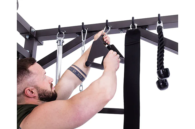 Klec je vybavena hrazdou, která nabízí několik možností úchopu a cvičebních poloh!