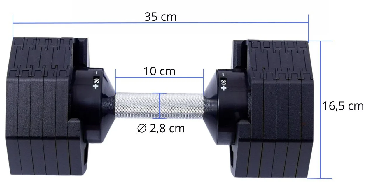 Tento set obsahuje činku s volitelnou hmotností v 10 úrovních, od 2 do 20 kg v krocích po cca 2 kg. Bezpečný trénink a snadnou manipulaci zajišťuje patentovaný blokovací mechanismus. Samotná hmotnost lze upravit pouze v okamžiku kdy je činky uložena v základním stojanu, který je samozřejmě součástí balení.