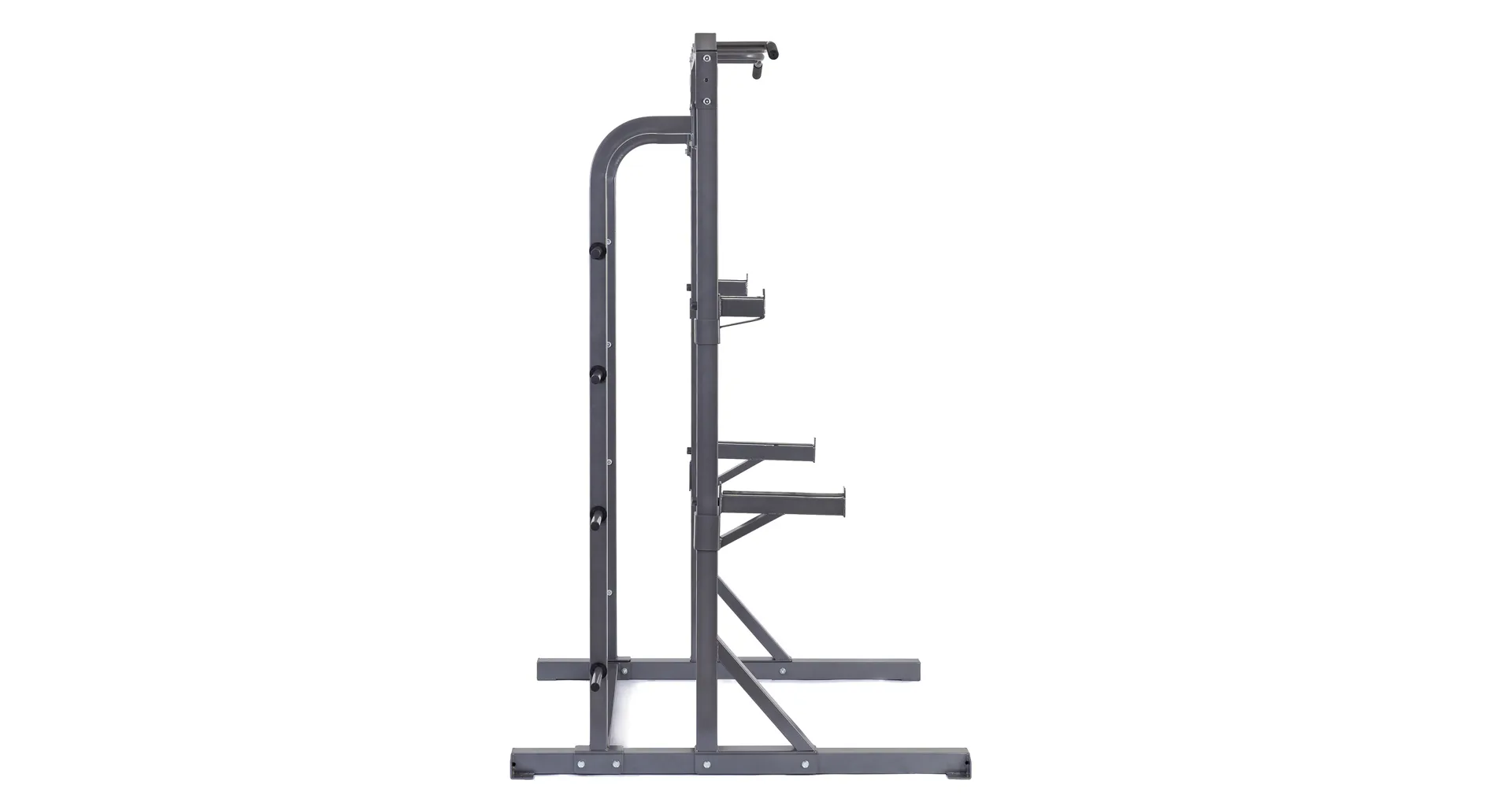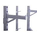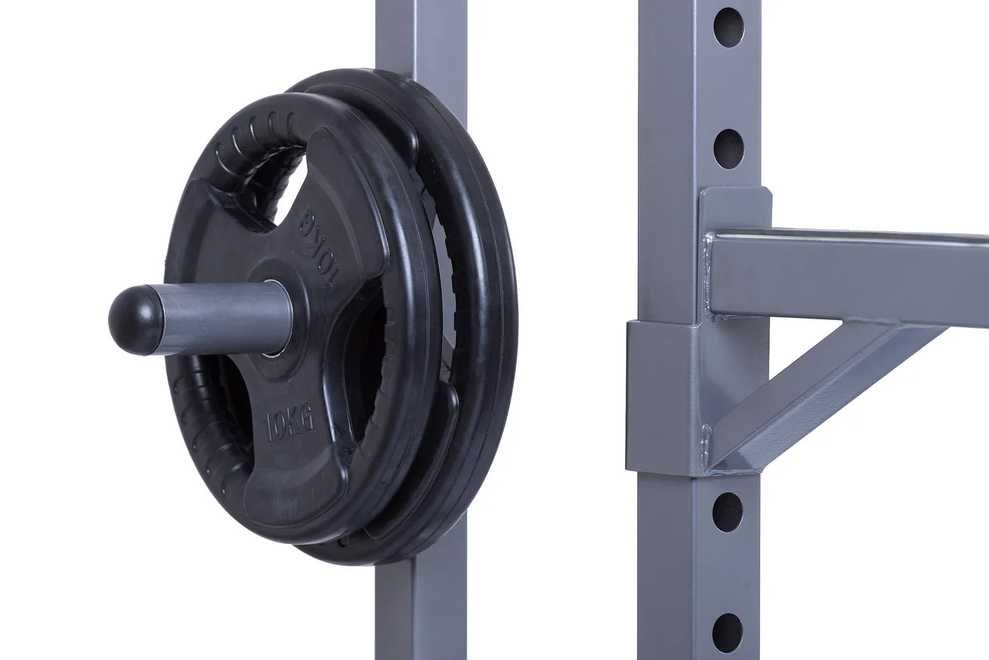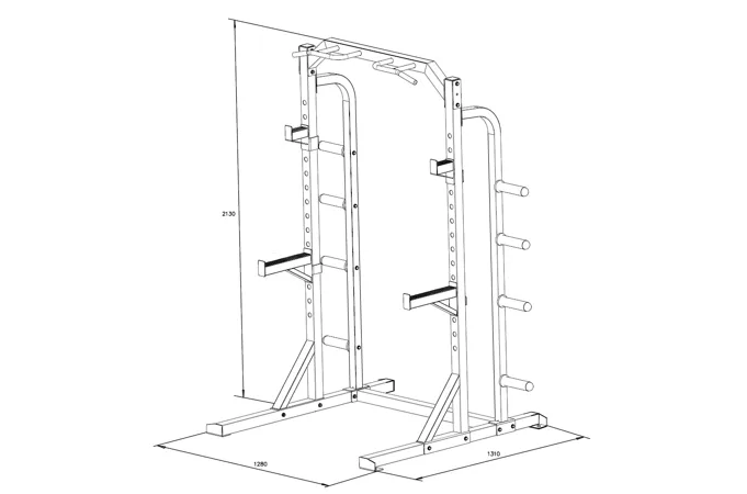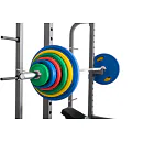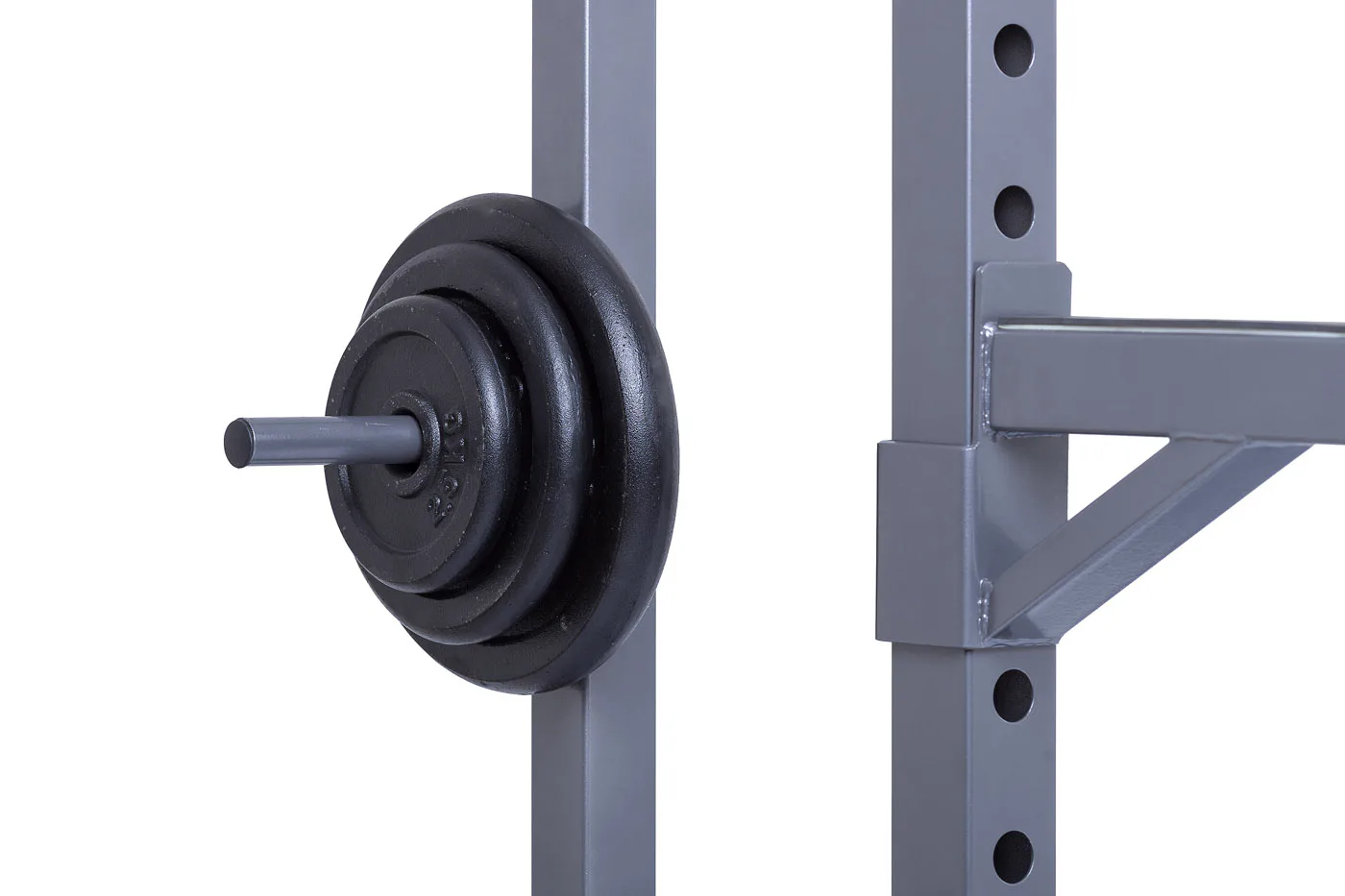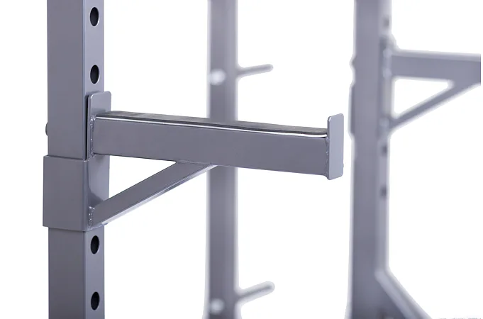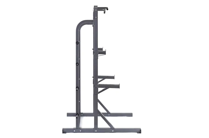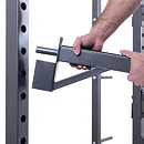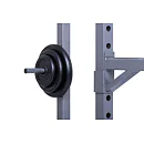 Na boku stojanu jsou instalovány praktické odkládací trny na kotouče, ty lze tedy pohodlně nakládat na činku a po docvičení bezpečně uložit na své místo. Trnů je celkem osm a mají průměr 25 mm a v případě potřeby je lze doplnit adaptérem na olympijské kotouče s vrtáním 50 mm. Adaptéry nejsou součástí dodávky, lze si je u nás dokoupit!