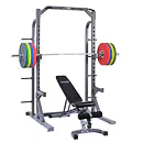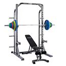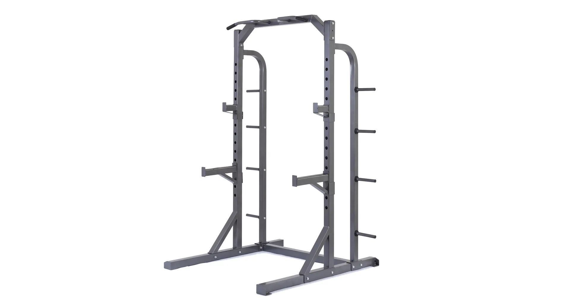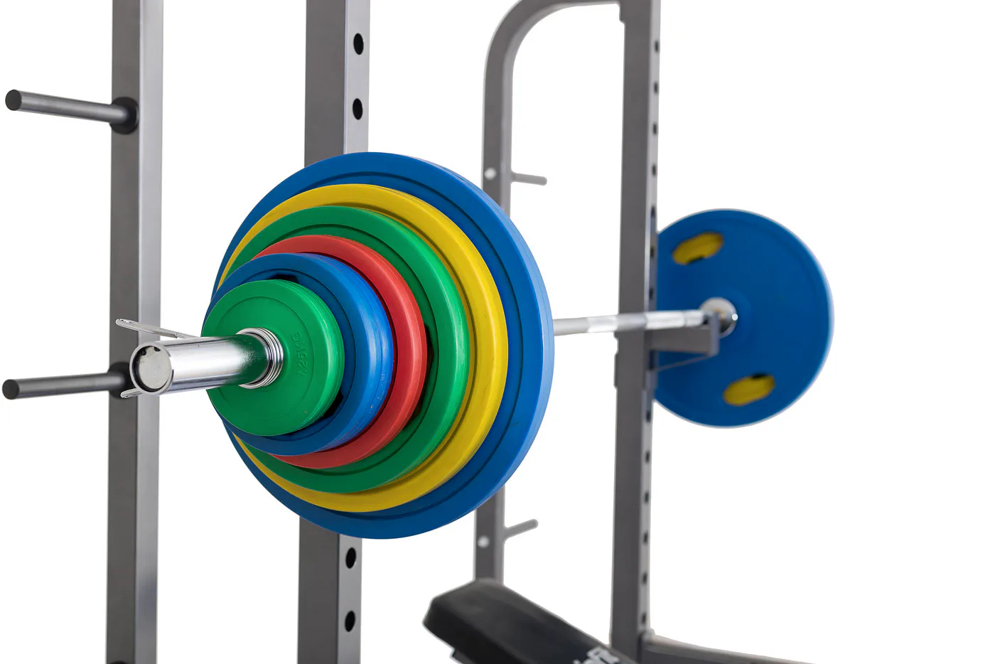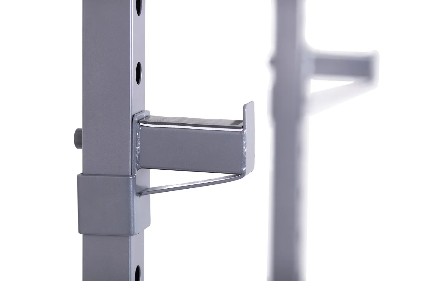 Na boku stojanu jsou instalovány praktické odkládací trny na kotouče, ty lze tedy pohodlně nakládat na činku a po docvičení bezpečně uložit na své místo. Trnů je celkem osm a mají průměr 25 mm a v případě potřeby je lze doplnit adaptérem na olympijské kotouče s vrtáním 50 mm. Adaptéry nejsou součástí dodávky, lze si je u nás dokoupit!