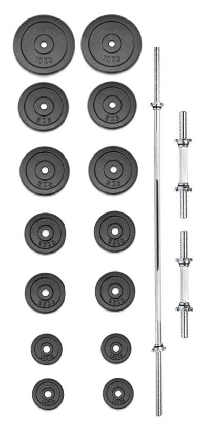 Variabilní činkový komplet sestavený z kvalitních komponentů je vynikajícím doplňkem každé domácí i komerční posilovny. Rozmanitá skladba setu zaručuje komfortní a bezpečný trénink. Součástí tohoto setu je velká obouruční hřídel na činku, dvě jednoruční hřídele a sada litinových kotoučů, vše s vrtáním 30 mm (průměr používaný i většinou výrobců posilovacích lavic a strojů). Uvedená váha setu je včetně osy.
