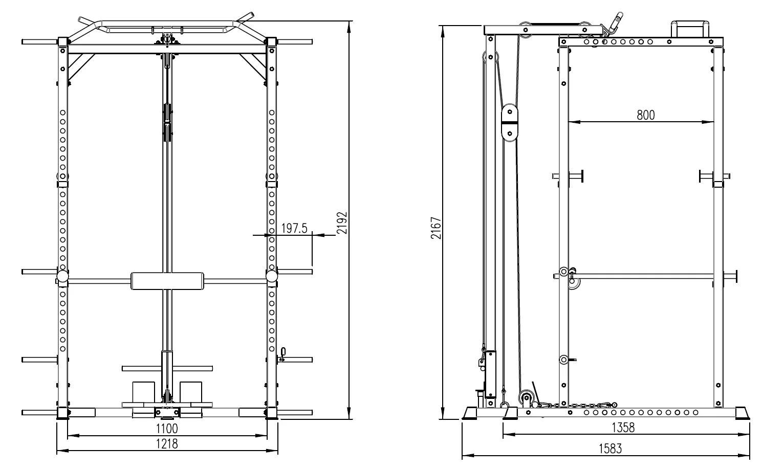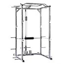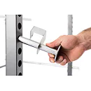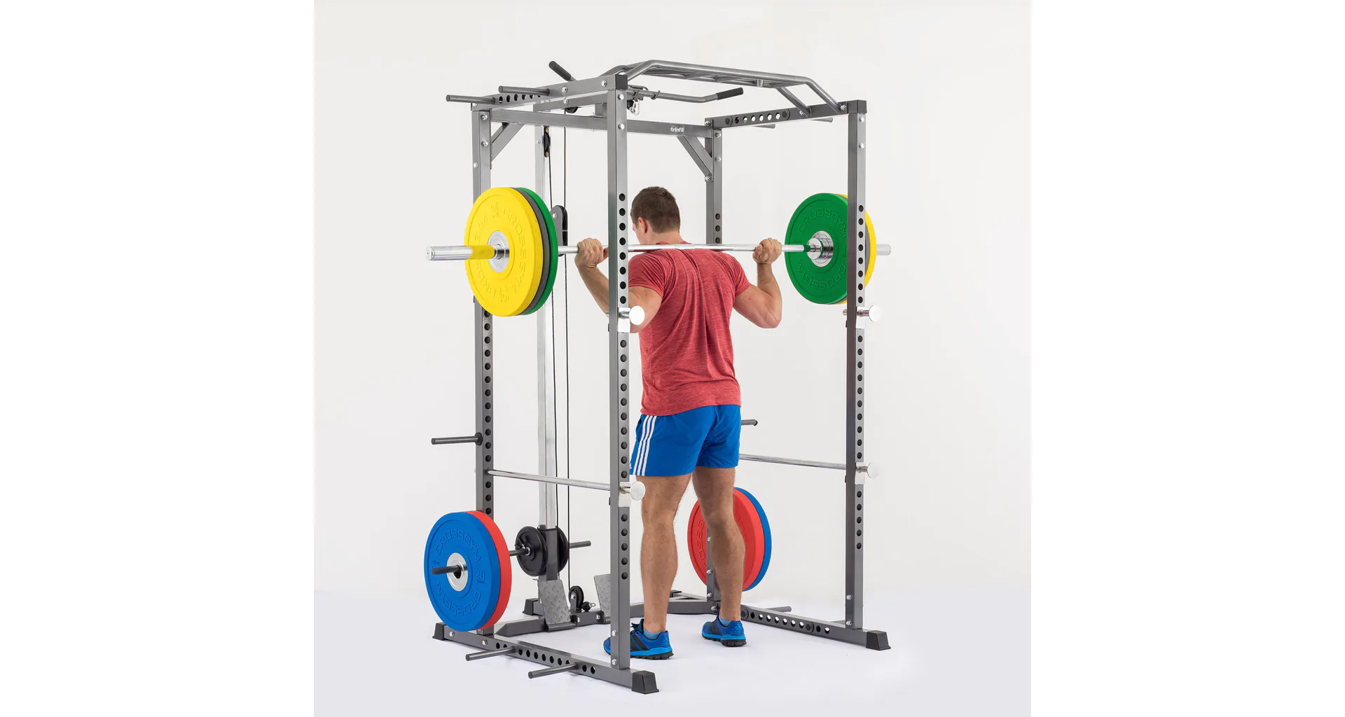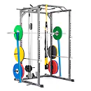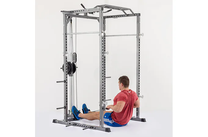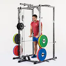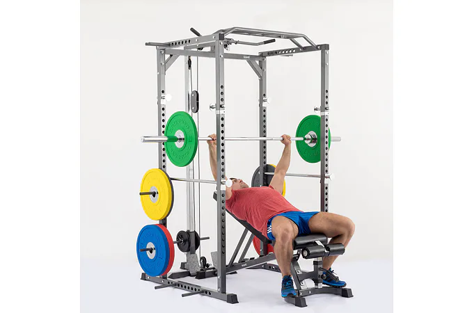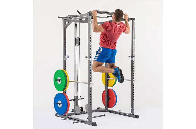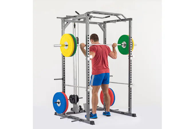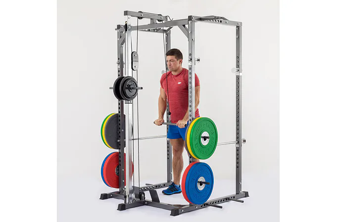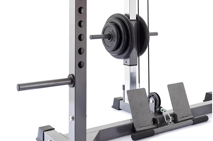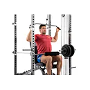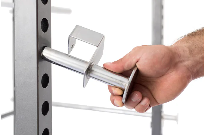 Standardní rozteč jakou znáte od profesionálních stojanů umožňuje pohodlné a komfortní cvičení, optimální úchop a bezpečné odkládání činky i vyšším osobám. Stojan má možnost jednoduchého výškového nastavení háků na činku do 16 pozic a je tedy použitelný pro všechny cviky a všechny výšky postav až do 215 cm. Kromě vlastních odkládacích háků je stroj vybaven i dalšími bezpečnosními odkládacími dorazy na činku pro případ, že ji už nejste schopni činku zvednout, případně tyto dorazy lze využít i jako odkládací plochu např. při cvičení bicepsu a dalších cviků, nemusíte tak činku odkládat na zem. Součástí posilovací klece je i kopletní horní a spodní kladka, včetně konstrukce na zapření nohou u dolní i spodní kladky zvyšující komfort při cvičení a umožňující využití maximálních vah. Výhodou stojanu jsou čtyři odkládací trny na kotouče umístěné na zadní straně stojanu na něž lze kotouče pohodlně odložit a dalších 8 speciálních polohovacích trnů pro použití čím dál více oblíbených odporových gum rozšiřujících využití věže.