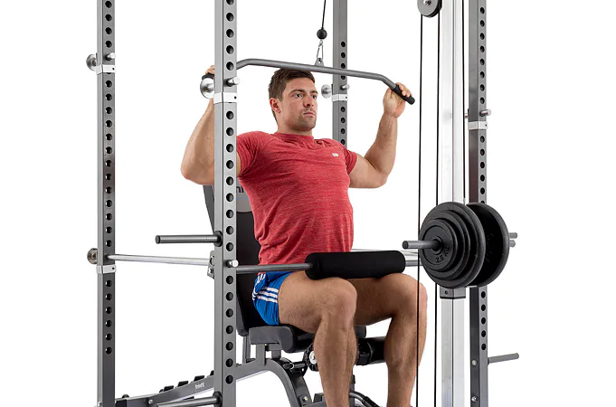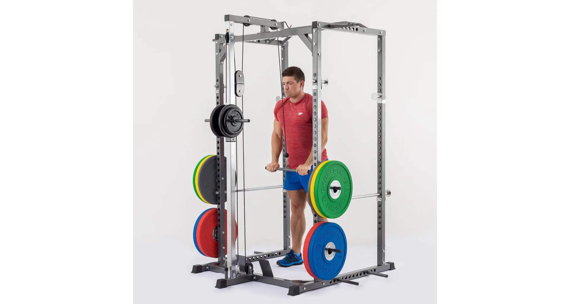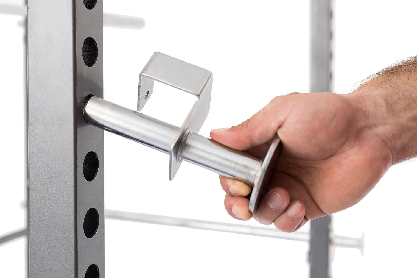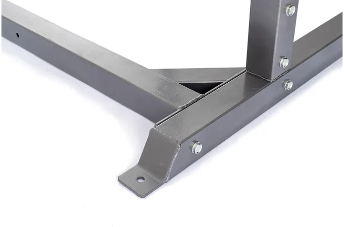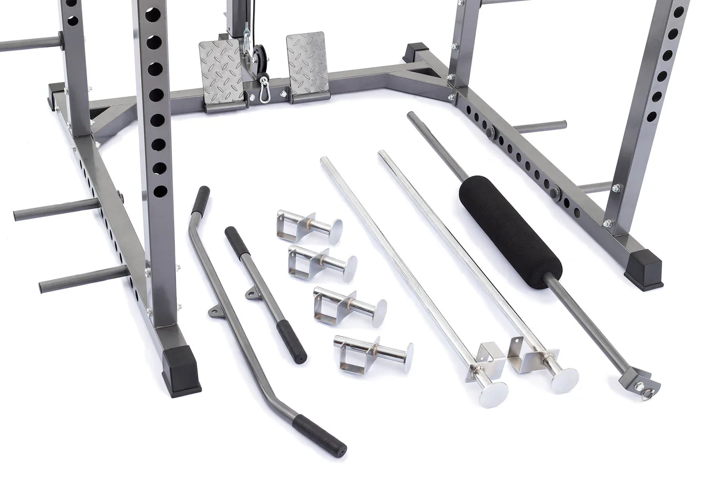 Standardní rozteč jakou znáte od profesionálních stojanů umožňuje pohodlné a komfortní cvičení, optimální úchop a bezpečné odkládání činky i vyšším osobám. Stojan má možnost jednoduchého výškového nastavení háků na činku do 16 pozic a je tedy použitelný pro všechny cviky a všechny výšky postav až do 215 cm. Kromě vlastních odkládacích háků je stroj vybaven i dalšími bezpečnosními odkládacími dorazy na činku pro případ, že ji už nejste schopni činku zvednout, případně tyto dorazy lze využít i jako odkládací plochu např. při cvičení bicepsu a dalších cviků, nemusíte tak činku odkládat na zem. Součástí posilovací klece je i kopletní horní a spodní kladka, včetně konstrukce na zapření nohou u dolní i spodní kladky zvyšující komfort při cvičení a umožňující využití maximálních vah. Výhodou stojanu jsou čtyři odkládací trny na kotouče umístěné na zadní straně stojanu na něž lze kotouče pohodlně odložit a dalších 8 speciálních polohovacích trnů pro použití čím dál více oblíbených odporových gum rozšiřujících využití věže.