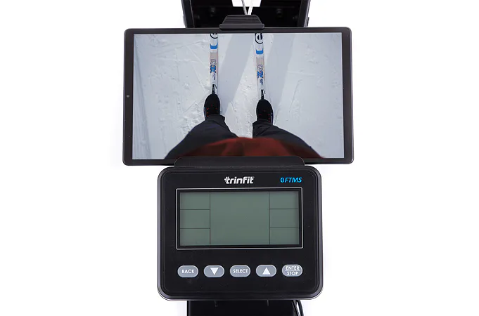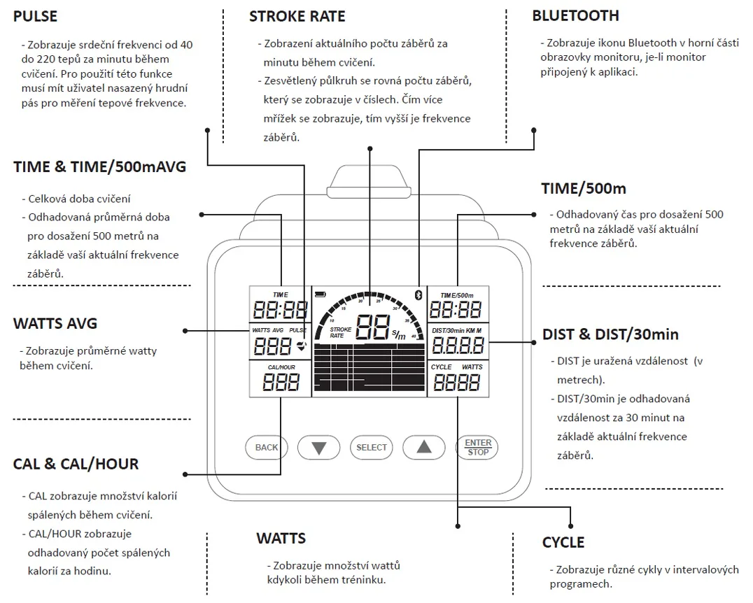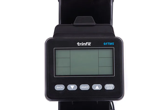 Tréninkový LCD počítač o velikosti 5,5" zobrazuje hodnoty jako je puls, počet záběrů za minutu, celková doba cvičení, watty, kalorie, čas, vzdálenost. Z programové nabídky si vyberete mezi 8 přednastavenými programy, kterými jsou například rychlý start, odpočítávání času/vzdálenosti/kalorií, herní program, intervalový program 20/10 atd. Nejedná se o zátěž řídící programy. Pro lepší výsledky můžete spárovat trenažér s Bluetooth hrudním pásem (není součástí balení).