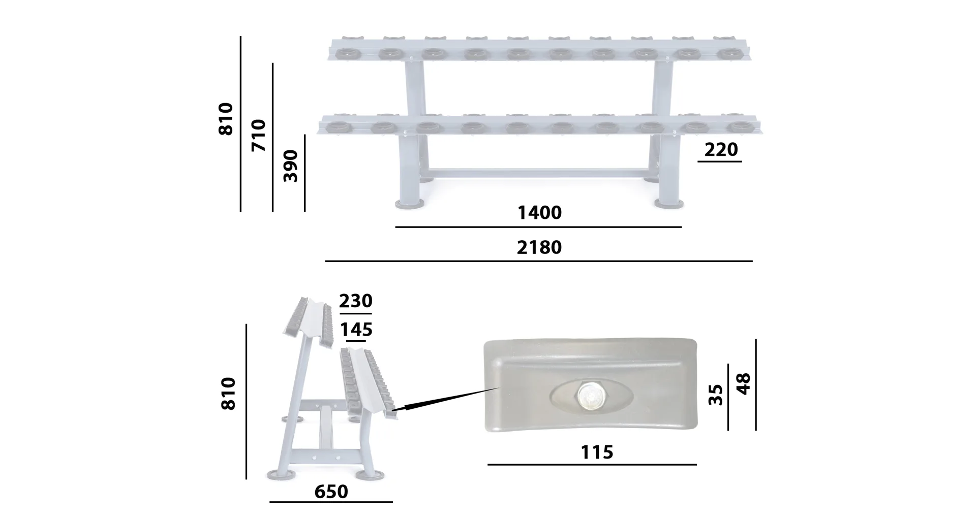 Odkládací stojan na jednoručky TRINFIT Rack Comfort zabere ve Vaší posilovně prostor o 218 x 65 x 81 cm (d x š x v). Nohy stojanu jsou opatřeny gumovými podložkami, které zajistí šetrnost k Vaší podlahové krytině.