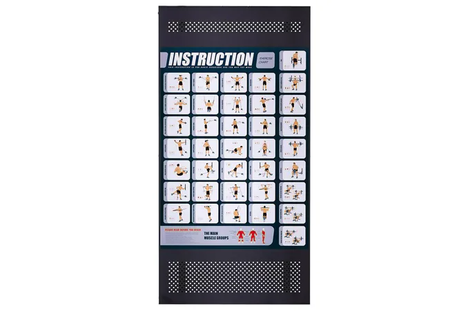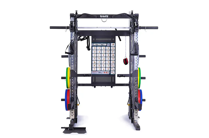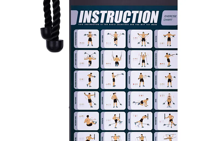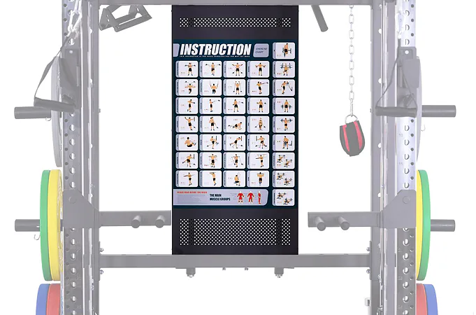 TRINFIT Tabulka se cviky pro CX60 obsahuje vyobrazení cviků, které je možné provádět na posilovací kleci TRINFIT Multi Smith CX60.
