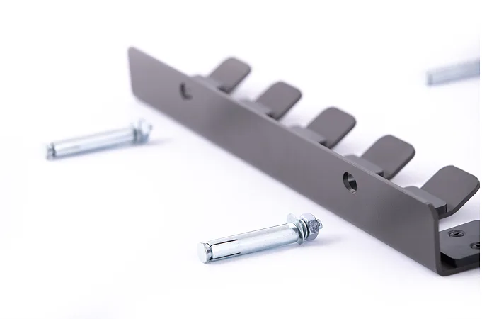 TRINFIT Wall bar holder vertical je držák na dlouhé činky, který se upevňuje do zdi. Pomocí jednoduchého upevňovacího systému můžete stojan zavěsit do požadované výšky. Montážní šrouby jsou součástí!