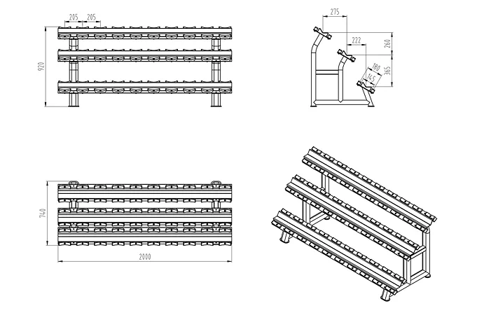 Třířadý stojan na činky PRIMAL Matte Nero na činky 2,5 až 50 kg. Třířadý stojan nabízí prostor pro 15 párů činek. Nejmenší a nejlehčí jsou umístěny nahoře a nejtěžší a největší ve spodní části stojanu.