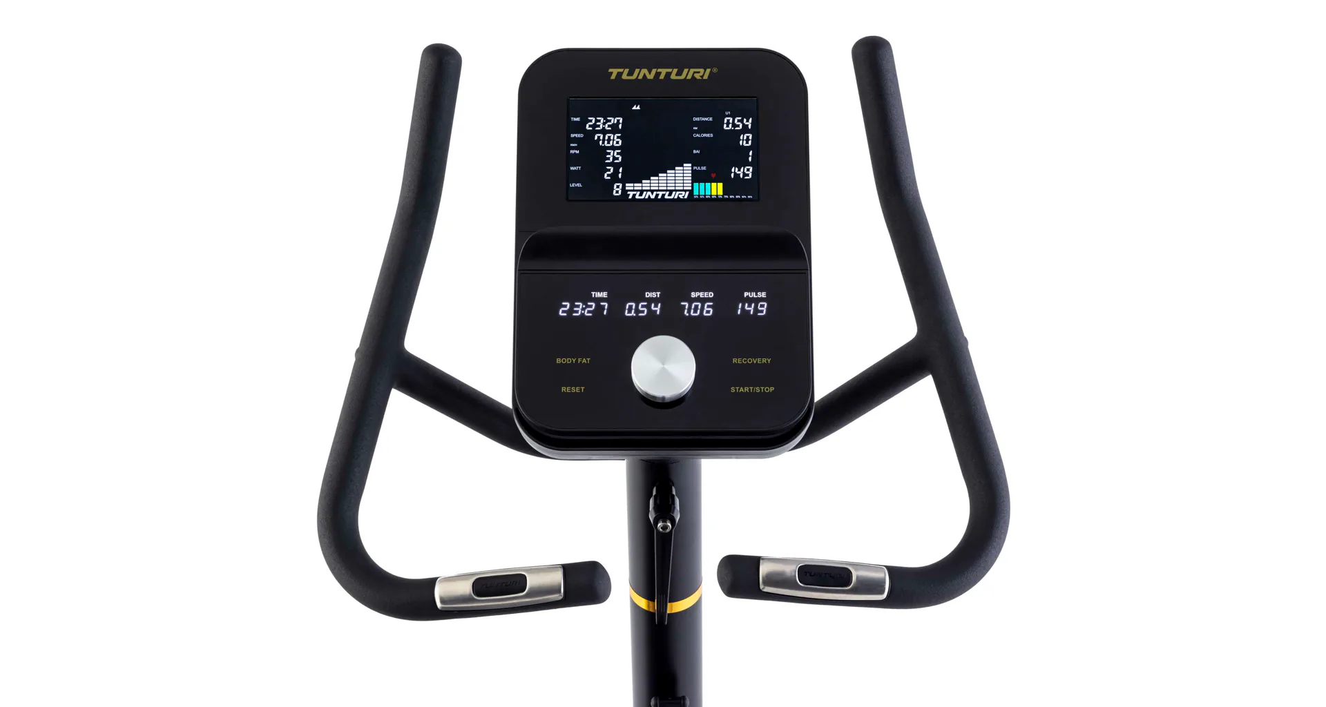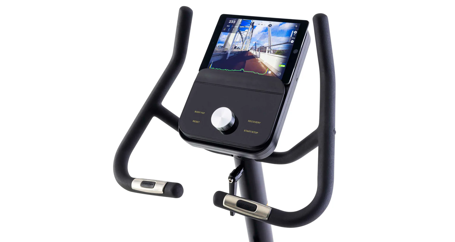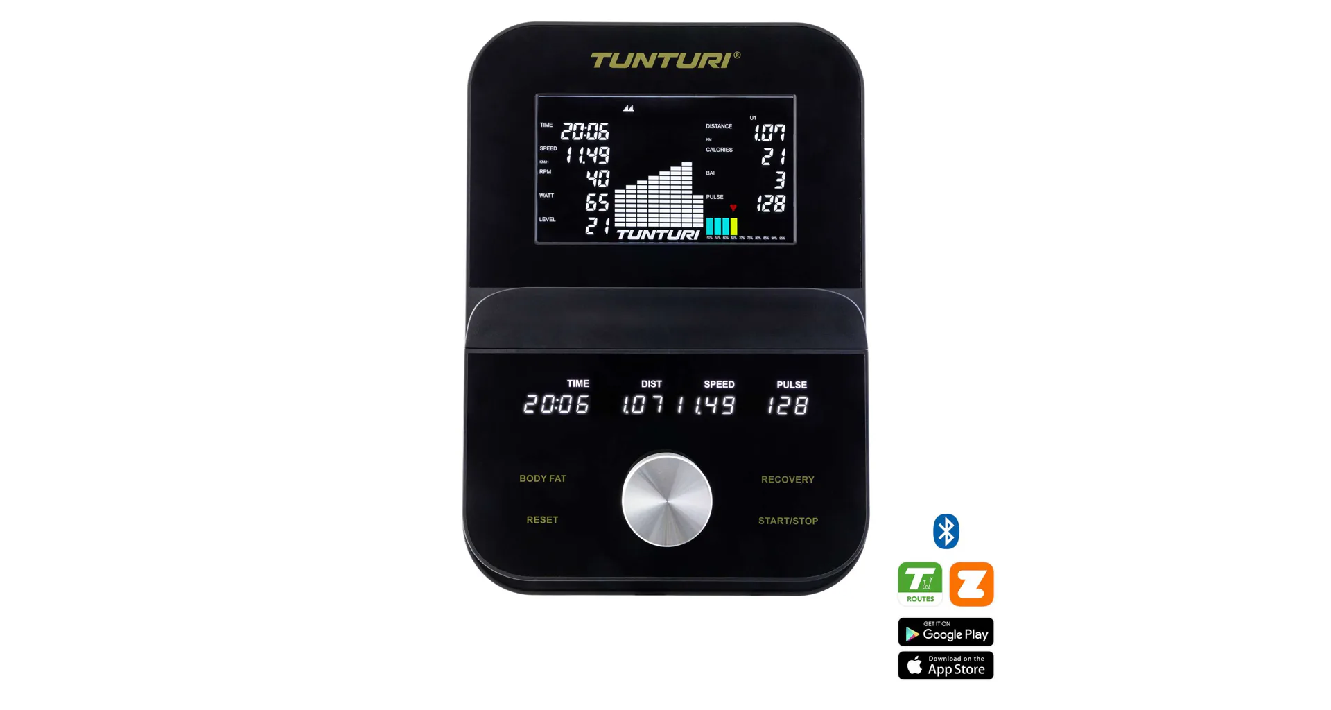 Jasná obrazovka je nakloněná pro optimální viditelnost i při silném odrazu a integrovaný modul Bluetooth umožňuje připojit trenažér přímo k aplikacím, jako jsou Tunturi Routes, Kinomap a Zwift.