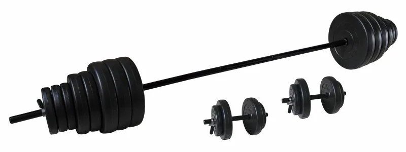 TUNTURI činkový vynilový set pro vzpírání 50 kg je složený z velké osy o průměru 25 mm a délce 152 cm naložené kotouči o celkové váze 50 kg a dvěma osami o délce 36 cm. Činkový set se skládá z 16 kotoučů (6 x 5 kg, 4 x 2,5 kg a 6 x 1,25 kg) a 6 bezpečnostních uzávěrů.