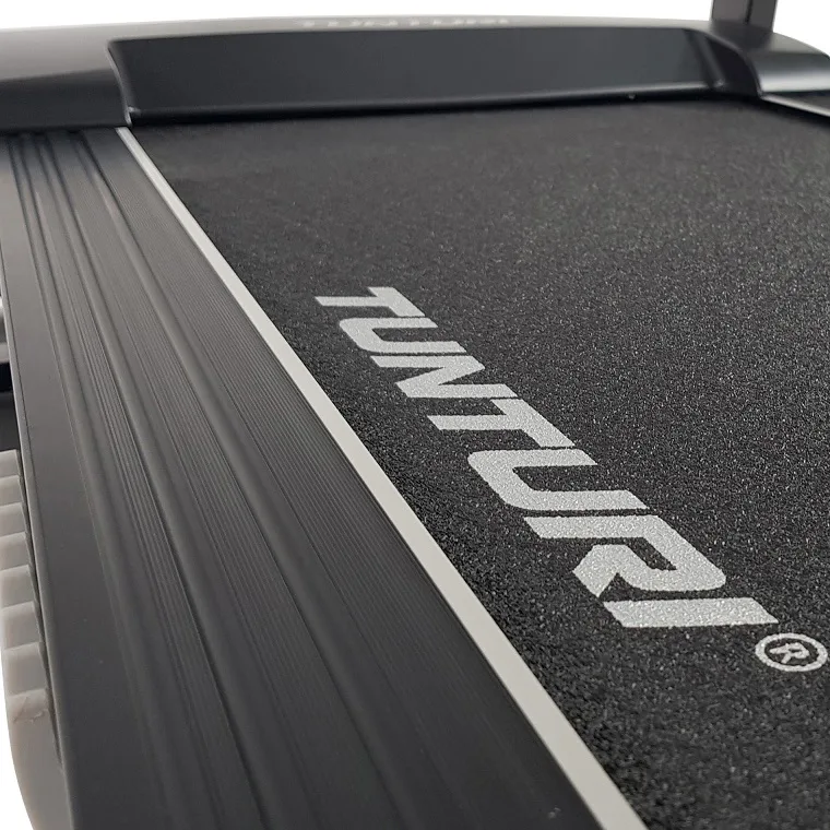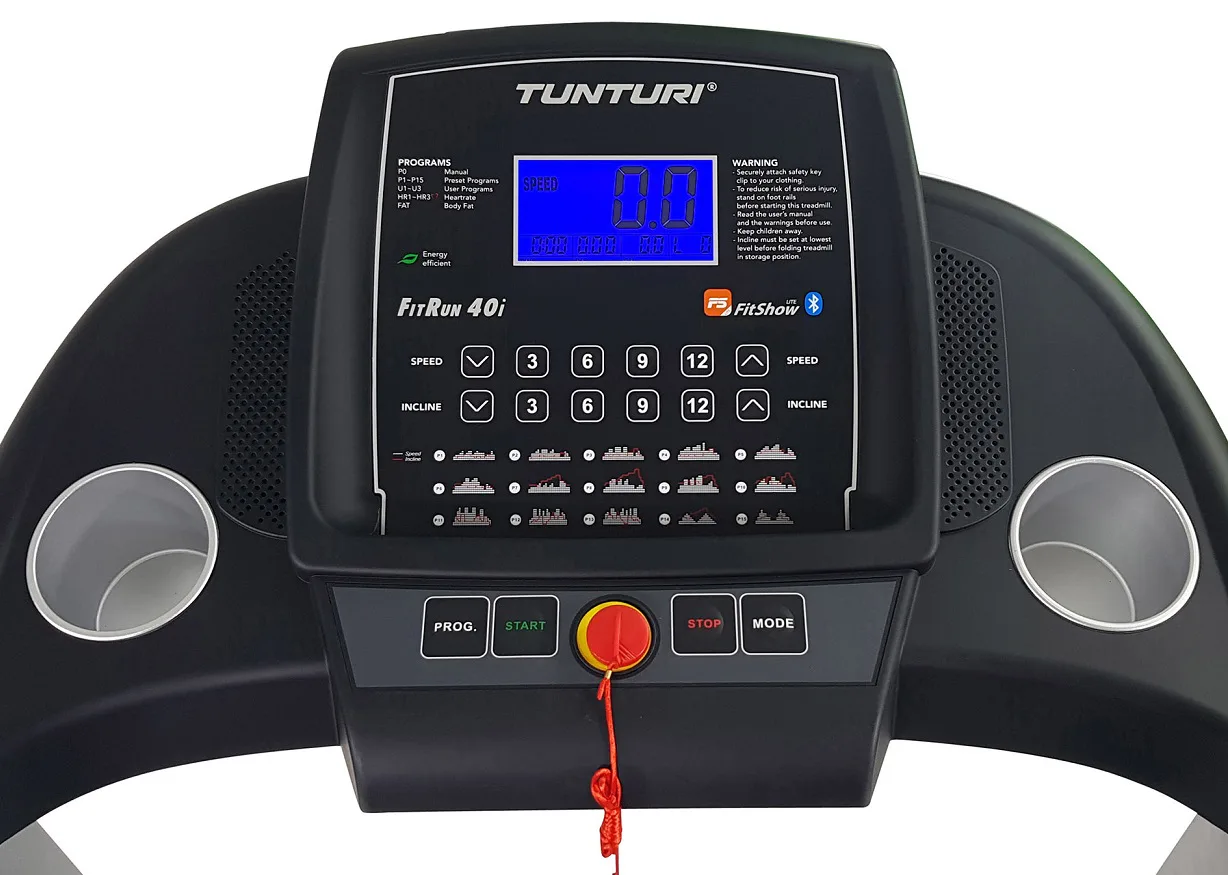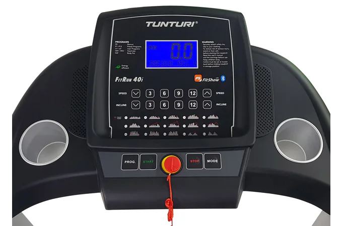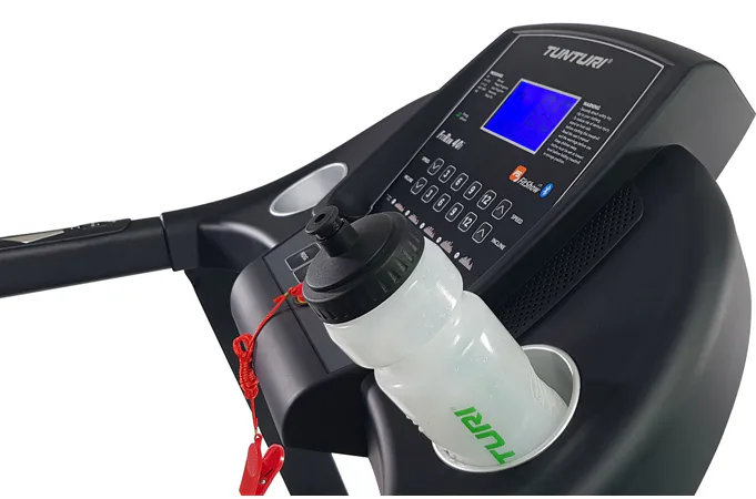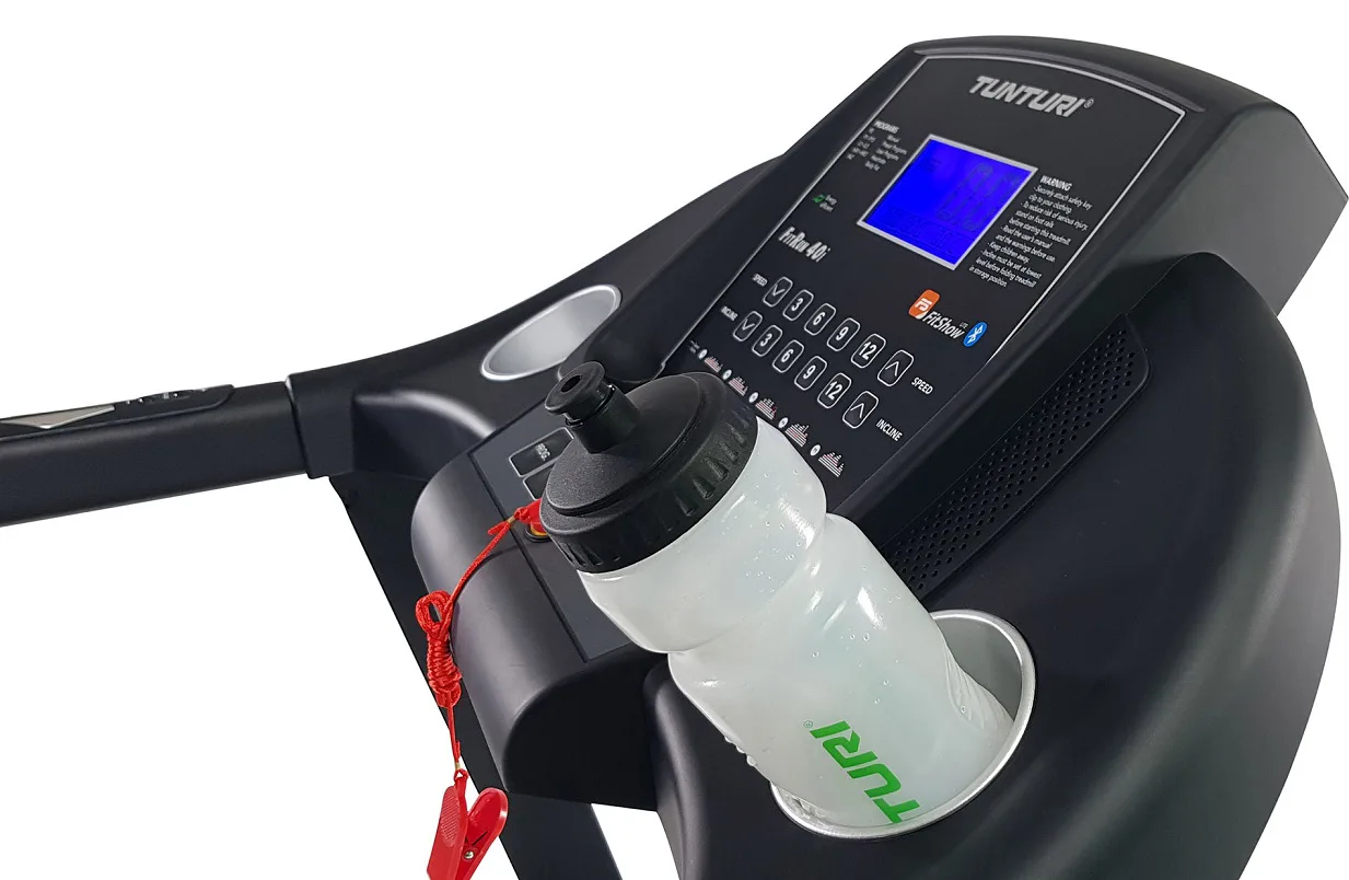 Trenažér Tunturi FitRun 40i disponuje přehledným počítačem, Bluetooth zařízením, držákem na tablet, držákem na lahev, transportními kolečky a vyrovnávači nerovnosti.