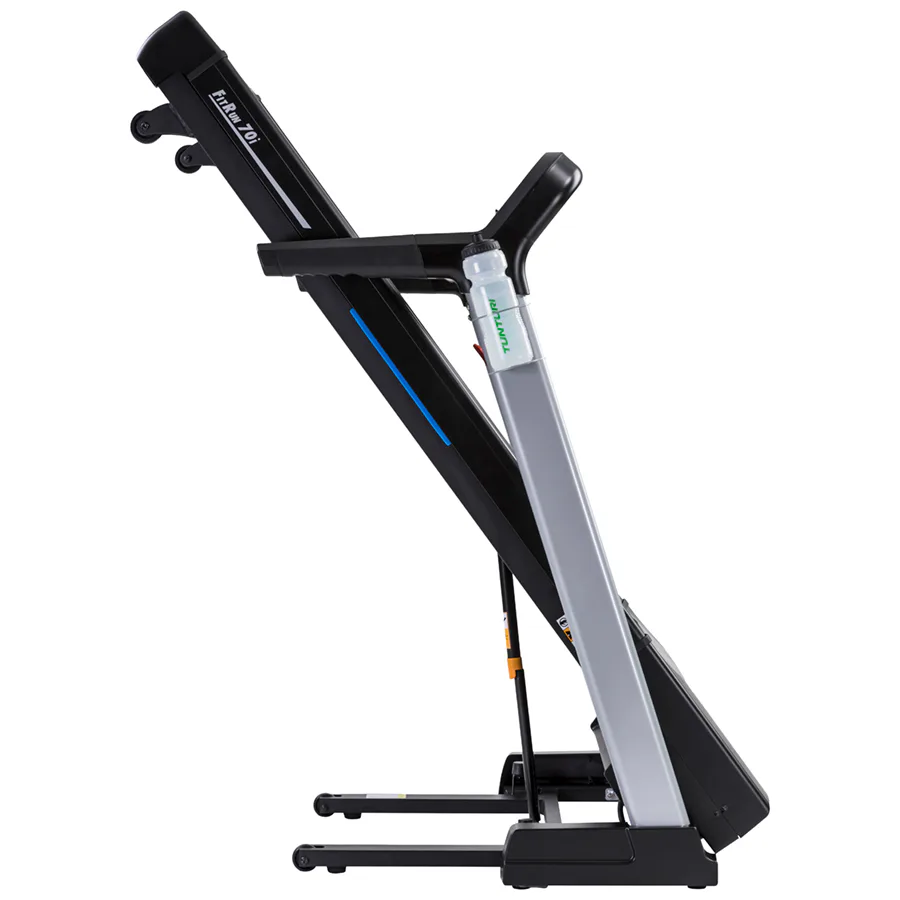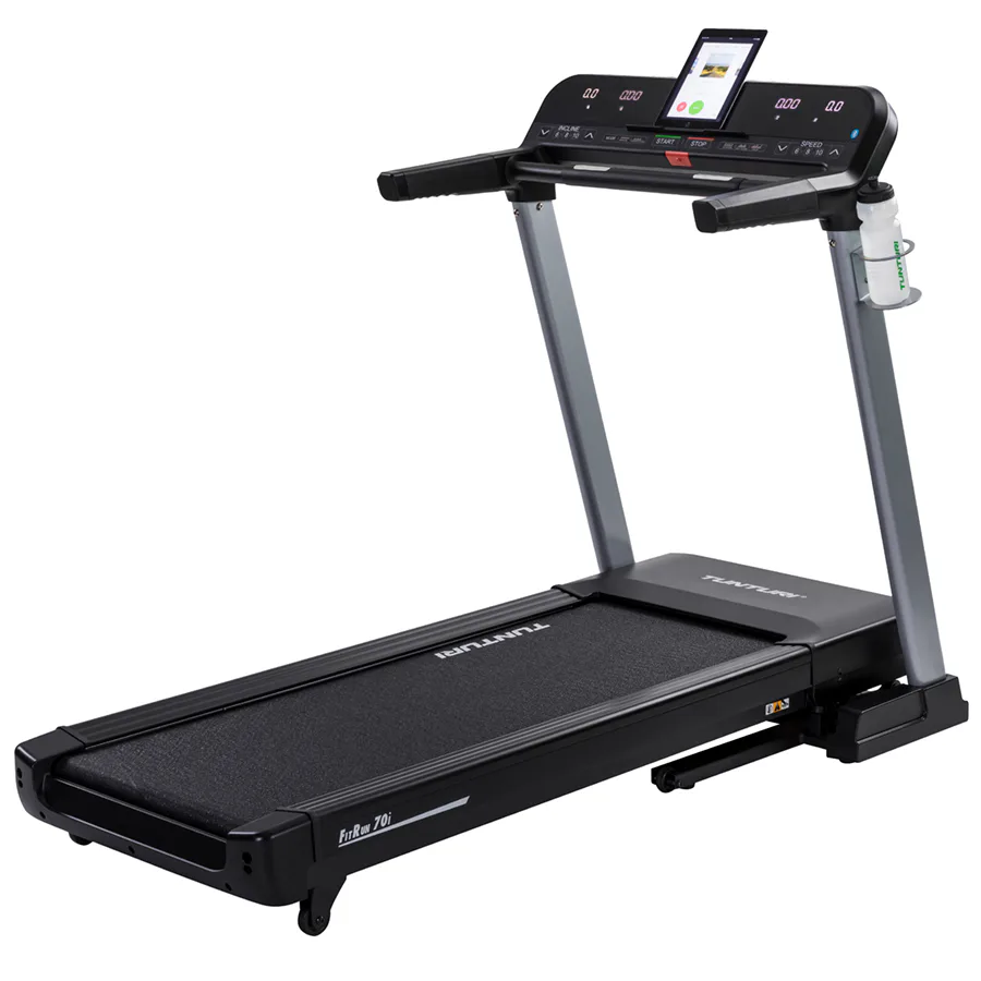 Trenažér TUNTURI FitRun 70i je vybaven transportními kolečky pro snazší manipulaci a má možnost složení pro lepší manipulaci v prostoru a úsporu místa.
