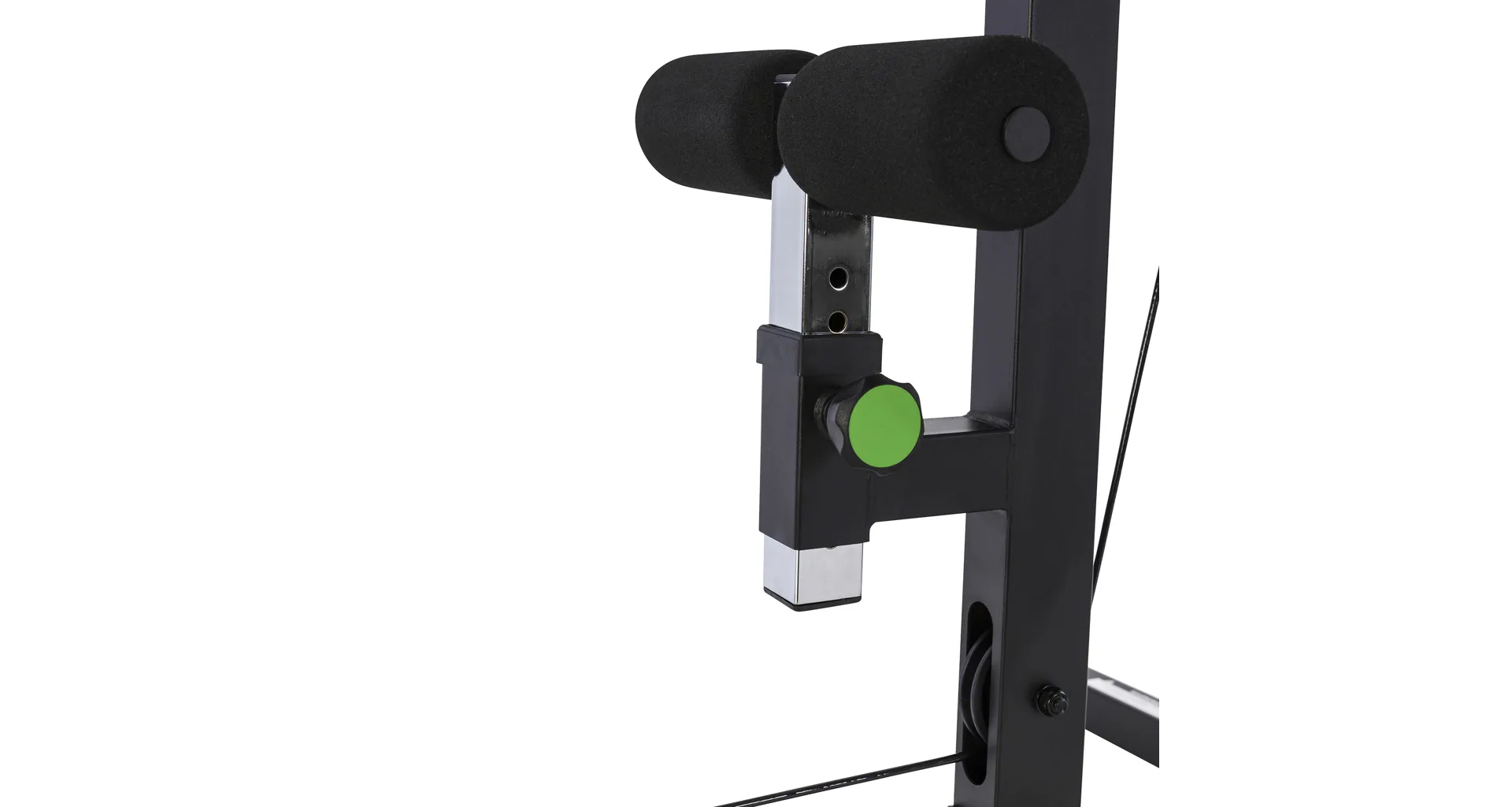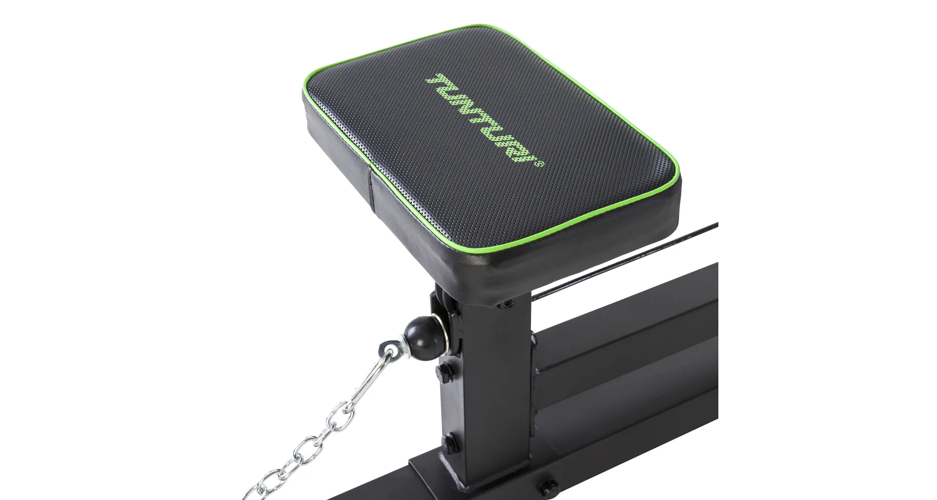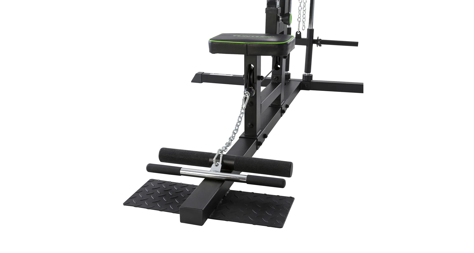 TUNTURI PL60 Lat Pulley je posilovací stroj vhodný do domácího prostředí, který je vybaven kladkovou konstrukcí v horní i dolní části, pěnovými válečky pro podporu kolen, sedákem a trny na závaží.