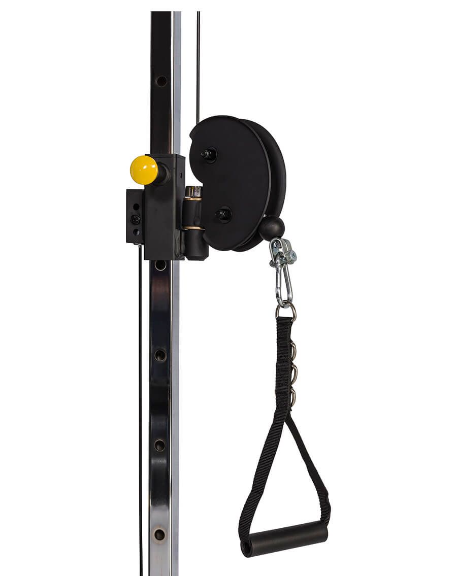 Disponuje masivní ocelovou konstrukcí, kladky jsou osazeny ložisky a lanka mají odolný povrch proti poškození. Vertikální nastavení kladek lze volit ve 12 polohách a závaží má celkem 2 x 90 kg (nezávislé uspořádání) v převodovém poměru 1/2:1.