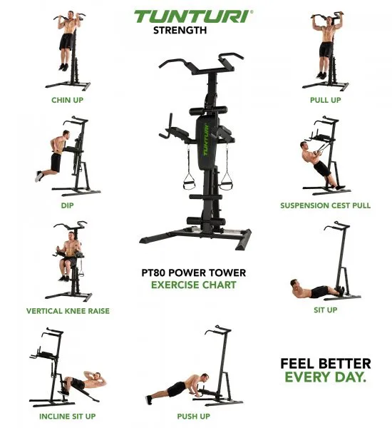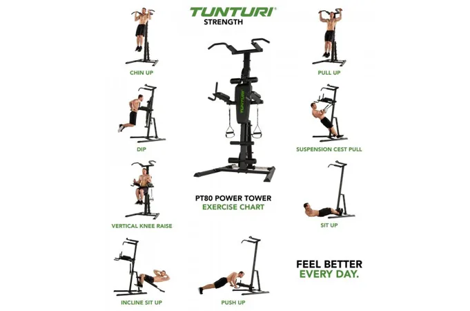 Výhodou posilovacího stroje Tunturi Power Tower PT80 je především bezpečné cvičení s vlastní tělesnou váhou a velká variabilita prováděných cviků a tedy i procvičení téměř všech svalových partií.