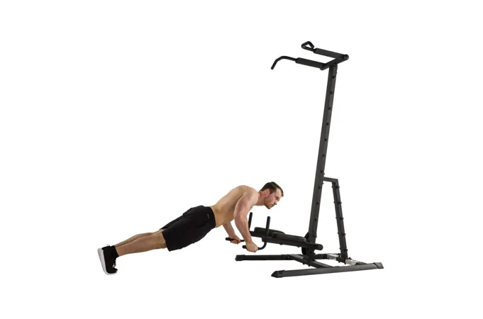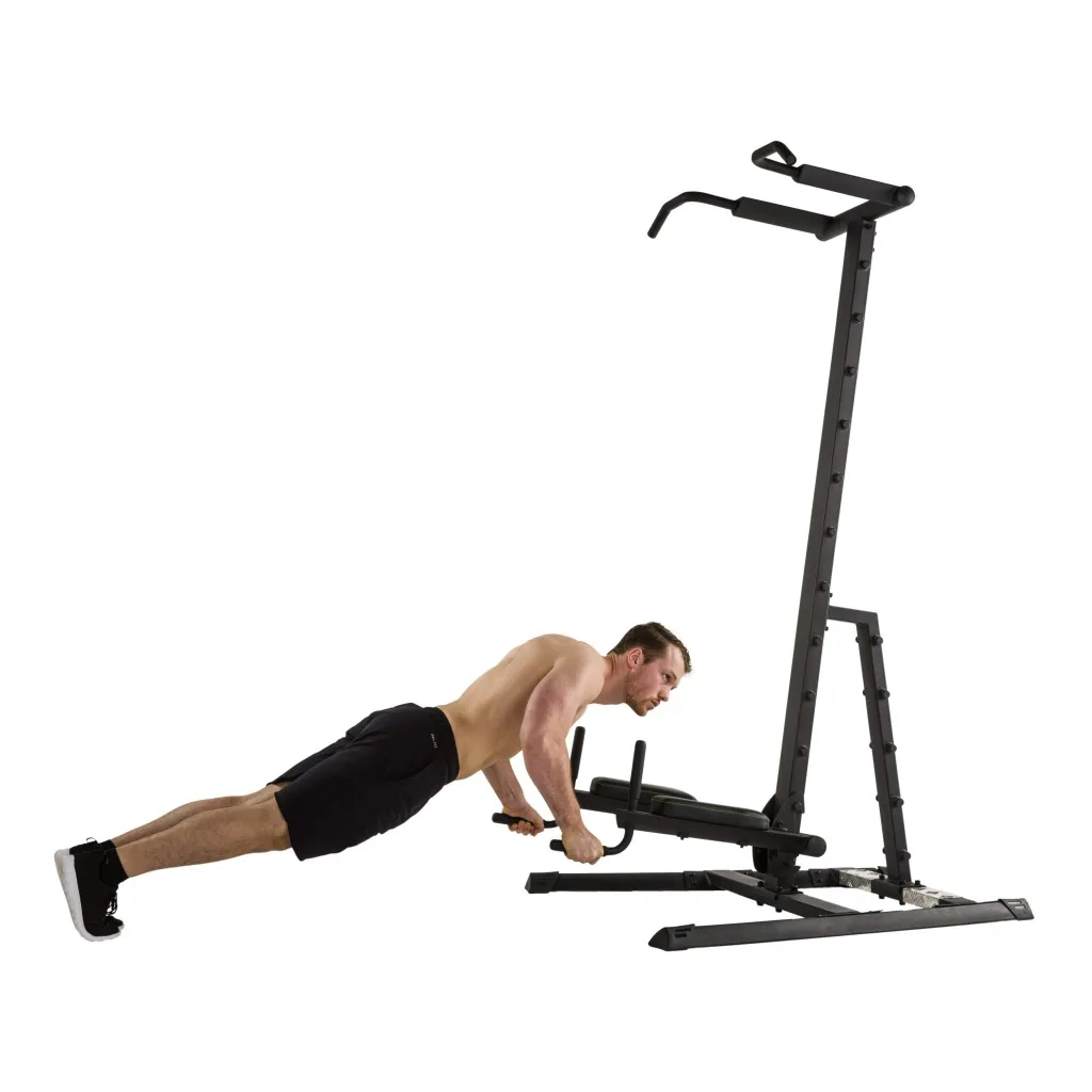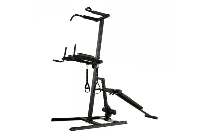 Masivní a odolná konstrukce je vybavena multiúchopovou hrazdou, lavicí na břicho, opěrkami na ruce, madly na kliky a závěsným systém na přítahy. Adaptéry na hlavním sloupku jsou výškově nastavitelné.