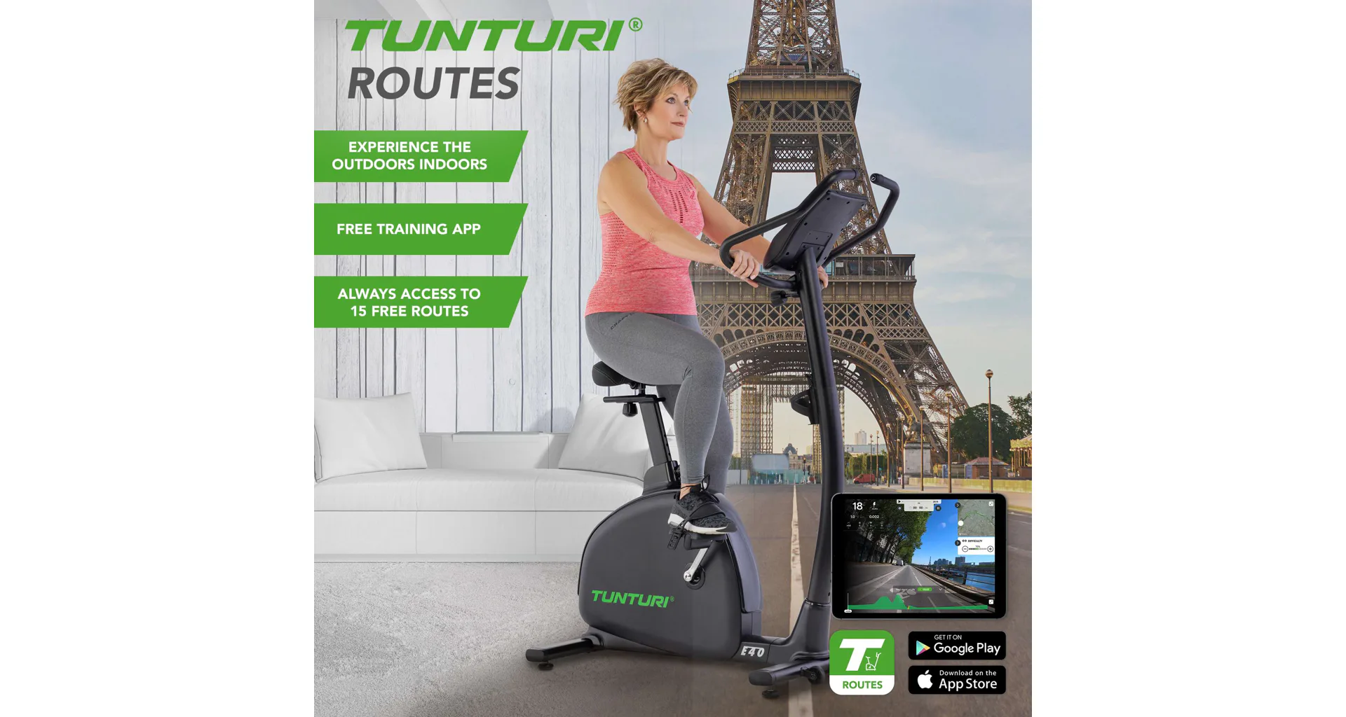 Chcete si rozšířit programovou nabídku a udělat si trénink ještě zábavnější? Pak se můžete přes Bluetooth připojit k tréninkovým aplikacím Tunturi Routes, iConsole+ Training, Zwift nebo Kinomap. Díky aplikacím máte k dispozici systém Google Maps, což vám umožní vytvářet vlastní trasy a překonávat nové výzvy.